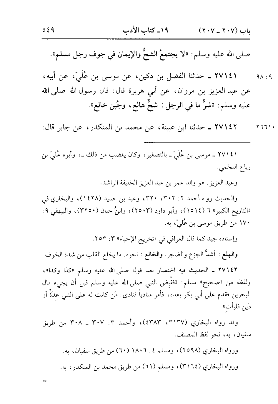 27141- حَدَّثَنَا الْفَضْلُ بْنُ دُكَيْنٍ ، عَنْ مُوسَى بْنِ عُلَيٍّ ، عَنْ أَبِيهِ ، عَنْ عَبْدِ الْعَزِيزِ بْنِ مَرْوَانَ ، عَنْ أَبِي هُرَيْرَةَ قَالَ : قَالَ رَسُولُ اللهِ صَلَّى الله عَلَيْهِ وَسَلَّمَ : شَرُّ مَا فِي الرَّجُلِ شُحٌّ هَالِعٌ وَجُبْنٌ خَالِعٌ.