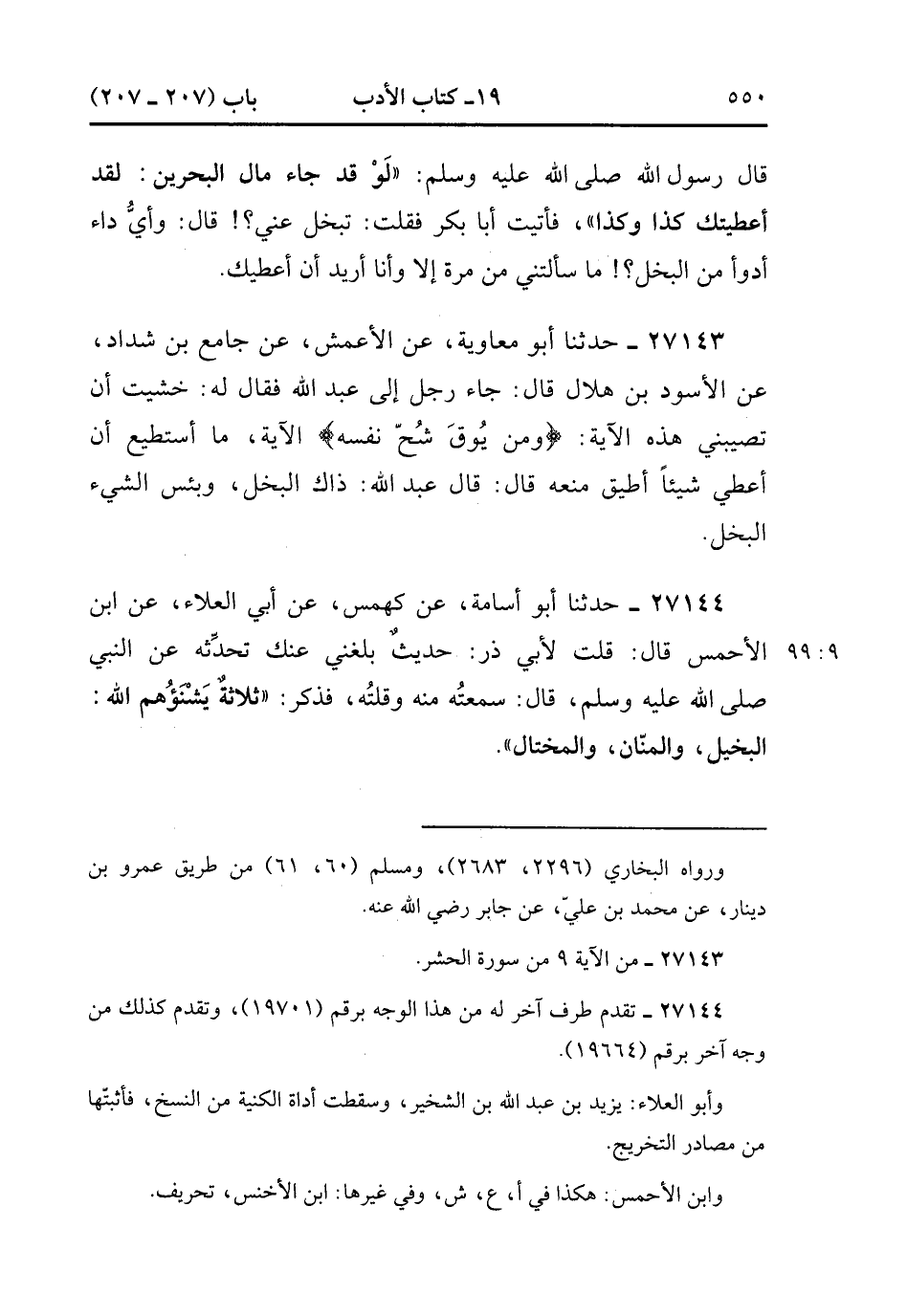 27144- حَدَّثَنَا أَبُو أُسَامَةَ ، عَنْ كَهْمَسٍ ، عَنْ أَبِي الْعَلاَءِ ، عَنِ ابْنِ الأَحْمَسِ قَالَ : قلْت لأَبِي ذَرٍّ : حَدِيثٌ بَلَغَنِي عَنك تُحَدِّثُه عَنِ النَّبِيِّ صَلَّى الله عَلَيْهِ وَسَلَّمَ ؟ ، قَالَ : سَمِعْتُهُ مِنْهُ وَقُلْته ، فَذَكَرَ ثَلاَثَةً يَشْنَؤُهُمَ اللَّهُ : الْبَخِيلُ وَالْمَنَّانُ وَالْمُخْتَالُ. (9/98).