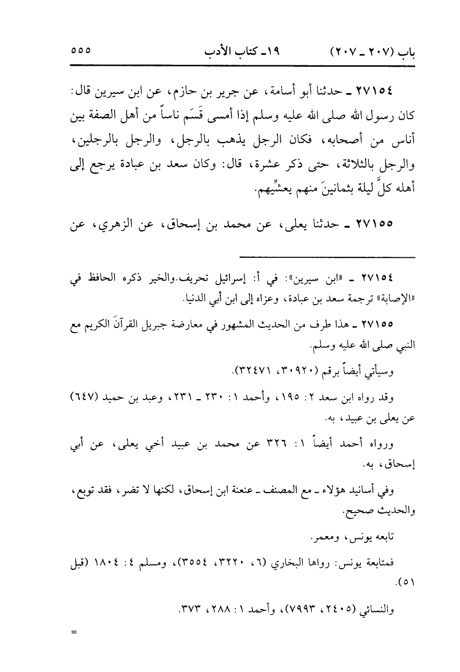 27154- حَدَّثَنَا أَبُو أُسَامَةَ ، عَنْ جَرِيرِ بْنِ حَازِمٍ ، عَنِ ابْنِ سِيرِينَ قَالَ : كَانَ رَسُولُ اللهِ صَلَّى الله عَلَيْهِ وَسَلَّمَ إذَا أَمْسَى قَسَمَ نَاسًا مِنْ أَهْلِ الصُّفَّةِ بَيْنَ أُنَاسٍ مِنْ أَصْحَابِهِ ، فَكَانَ الرَّجُلُ يَذْهَبُ بِالرَّجُلِ ، وَالرَّجُلُ بِالرَّجُلَيْنِ ، وَالرَّجُلُ بِالثَّلاَثَةِ حَتَّى ذَكَرَ عَشَرَةً ، قَالَ : وَكَانَ سَعْدُ بْنُ عُبَادَةَ يَرْجِعُ إلَى أَهْلِهِ كل ليلة بِثَمَانِينَ منهم يُعَشِّيهِمْ.