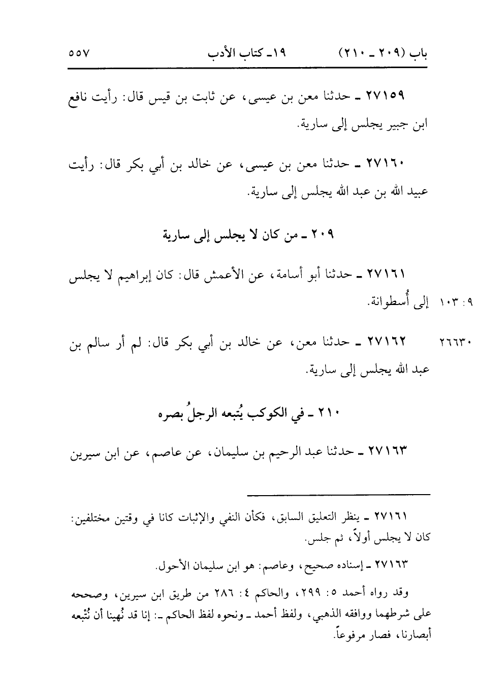 27163- حَدَّثَنَا عَبْدُ الرَّحِيمِ بْنُ سُلَيْمَانَ ، عَنْ عَاصِمٍ ، عَنِ ابْنِ سِيرِينَ قَالَ : نَزَلَ عَلَيْنَا أَبُو قَتَادَةَ الأَنْصَارِيُّ ، فَانْقَضَّ كَوْكَبٌ ، فَأَتْبَعْناهُ أَبْصَارَنَا ، فَنَهَانَا عَنْ ذَلِكَ. (9/103).