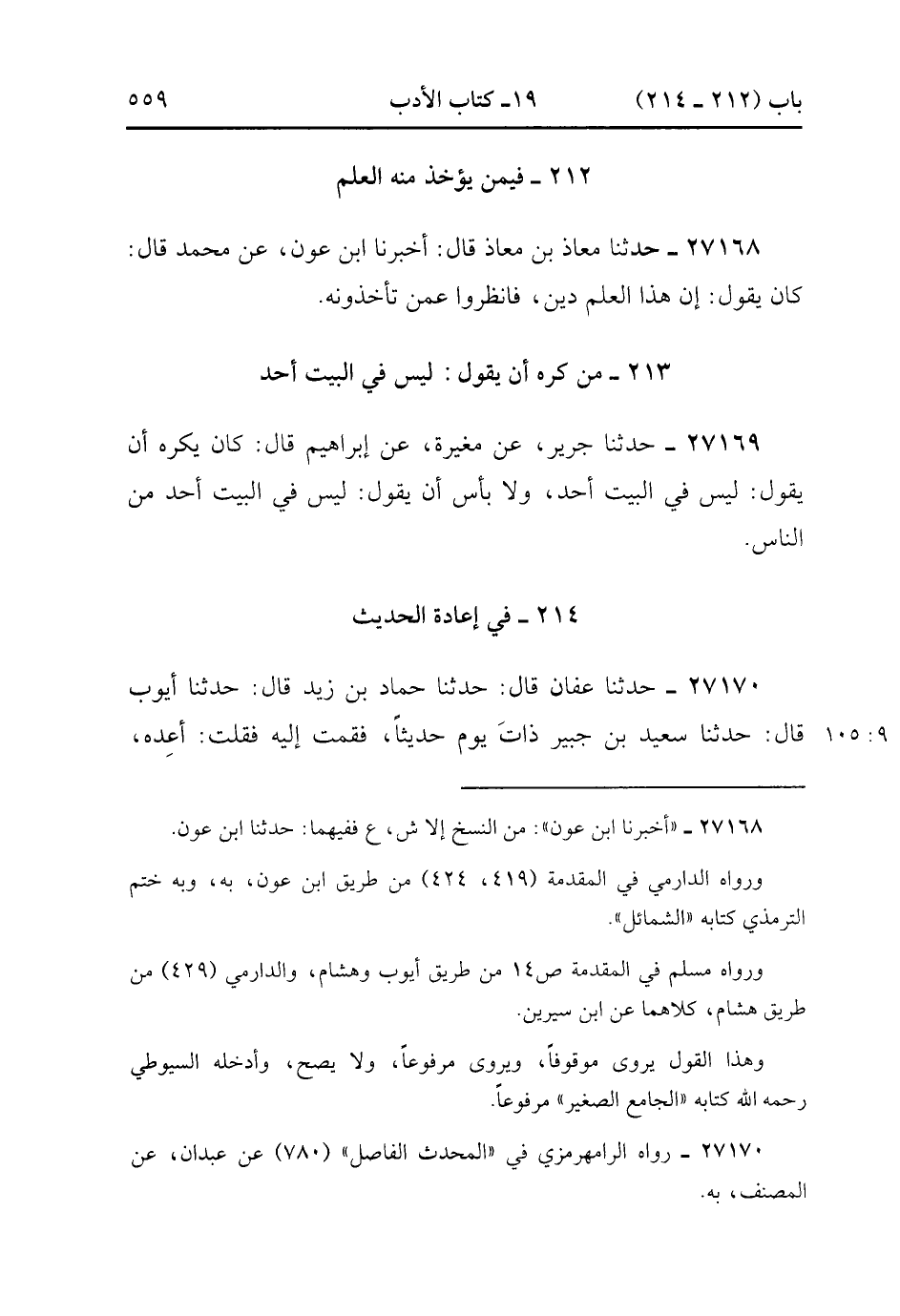 27168- حَدَّثَنَا مُعَاذُ بْنُ مُعَاذٍ , قَالَ : أَخْبَرَنَا ابْنُ عَوْنٍ ، عَنْ مُحَمَّدٍ قَالَ : كَانَ يَقُولُ : إنَّ هَذَا الْعِلْمَ دِينٌ فَانْظُرُوا عَمَّنْ تَأْخُذُونَهُ.