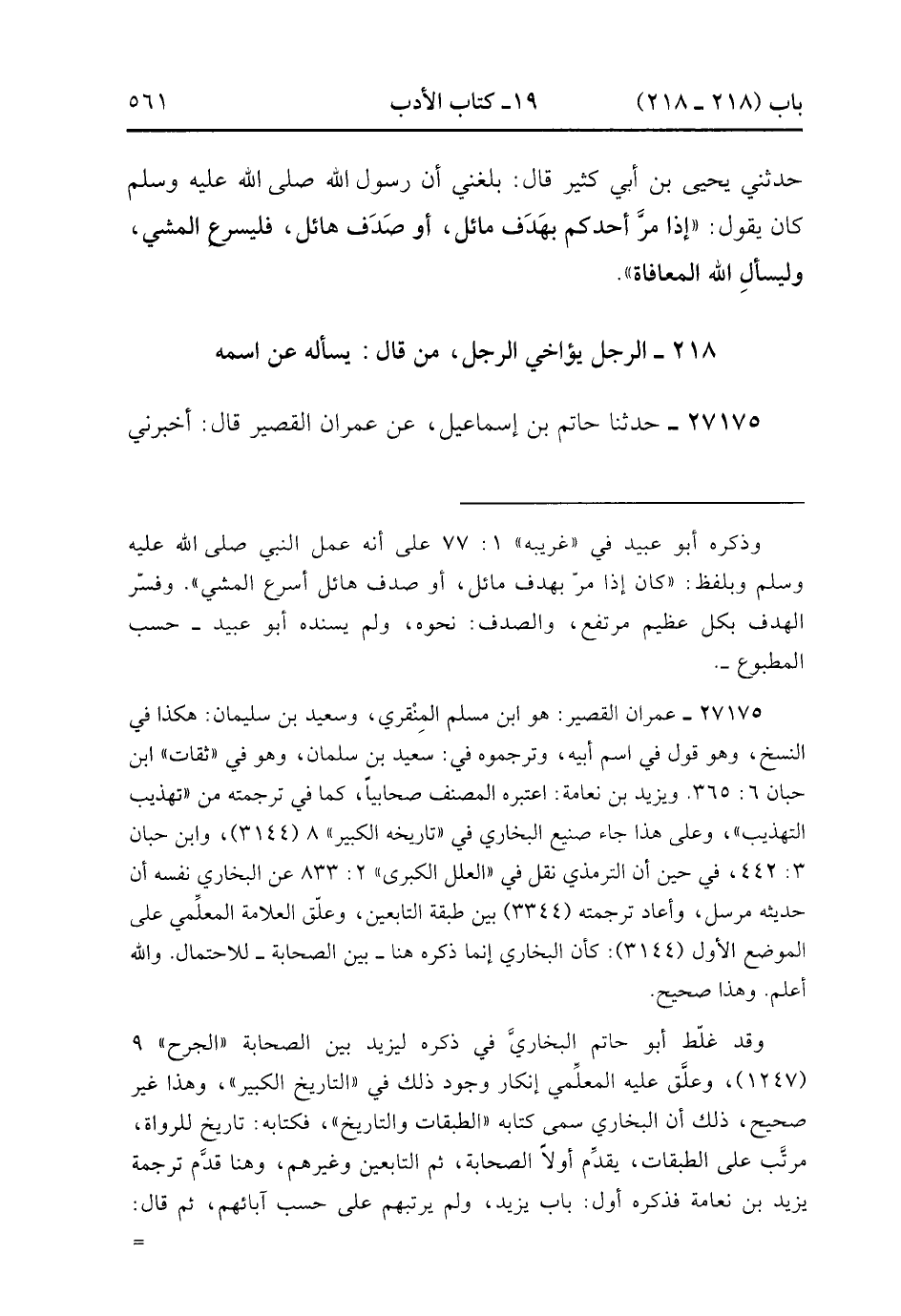 27175- حَدَّثَنَا حَاتِمُ بْنُ إسْمَاعِيلَ ، عَنْ عِمْرَانَ الْقَصِيرِ قَالَ : أَخْبَرَنِي سَعِيدُ بْنُ سُلَيْمَانَ ، عَنْ يَزِيدَ بْنِ نَعَامَةَ الضَّبِّيِّ قَالَ : قَالَ رَسُولُ اللهِ صَلَّى الله عَلَيْهِ وَسَلَّمَ : إذَا آخَى الرَّجُلُ الرَّجُلَ فَلْيَسْأَلْهُ ، عَنِ اسْمِهِ وَاسْمِ أَبِيهِ وَمِمَّنْ هُوَ ، فَإِنَّهُ أَوْصَلُ لِلْمَوَدَّةِ. (9/106).