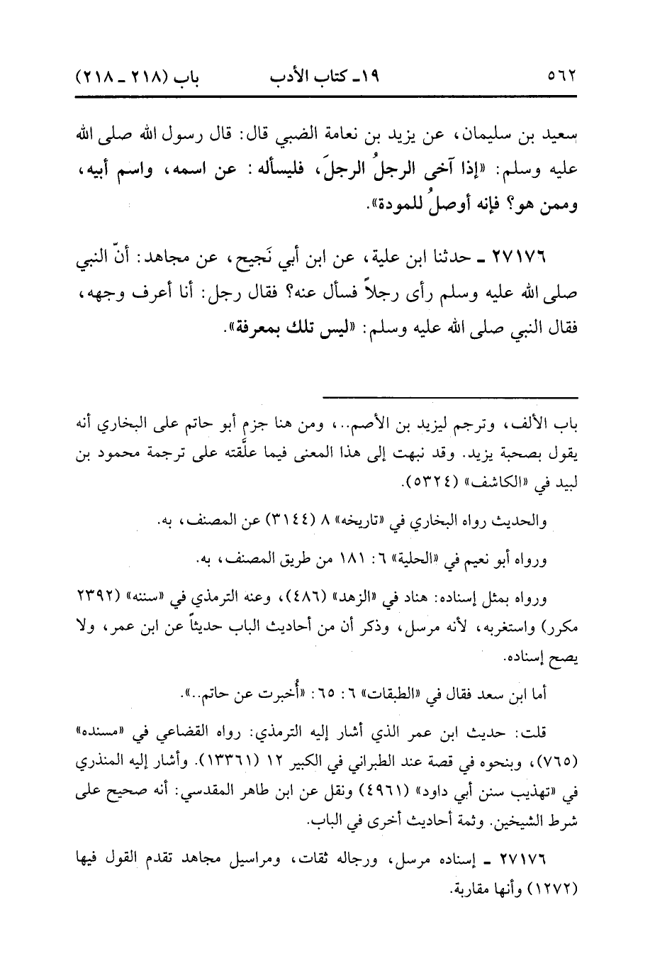 27176- حَدَّثَنَا ابْنُ عُلَيَّةَ ، عَنِ ابْنِ أَبِي نَجِيحٍ ، عَنْ مُجَاهِدٍ ، أَنَّ النَّبِيَّ صَلَّى الله عَلَيْهِ وَسَلَّمَ رَأَى رَجُلاً فَسَأَلَ عَنهُ ، فَقَالَ رَجُلٌ : أَنَا أَعْرِفُ وَجْهَهُ ، فَقَالَ النَّبِيُّ صَلَّى الله عَلَيْهِ وَسَلَّمَ : لَيْسَ تِلْكَ بِمَعْرِفَةٍ. (9/106).