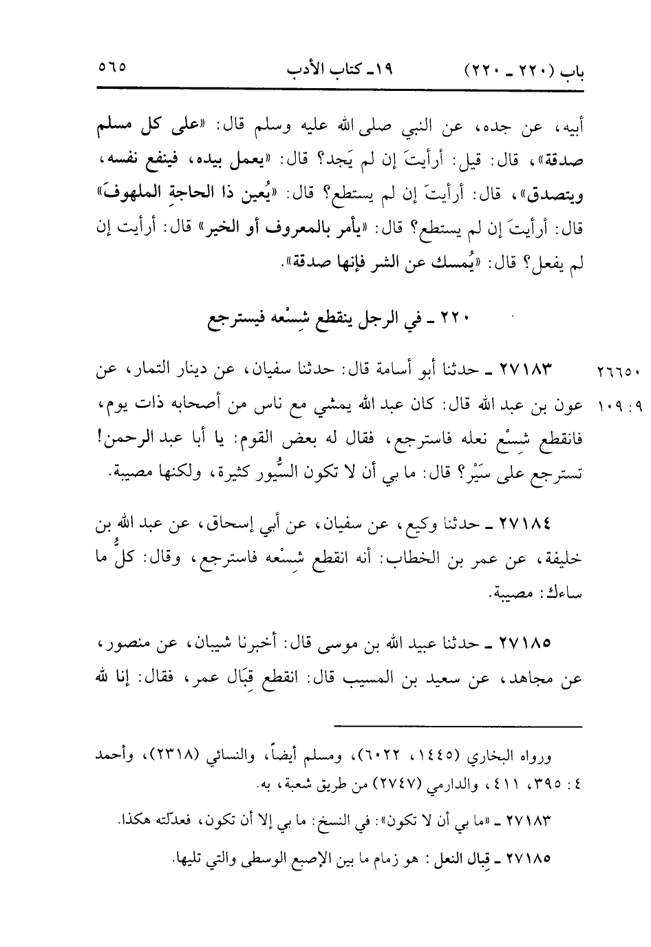 27183- حَدَّثَنَا أَبُو أُسَامَةَ , قَالَ : حدَّثَنَا سُفْيَانُ ، عَنْ دِينَارٍ التَّمَّارِ ، عَنْ عَوْنِ بْنِ عَبْدِ اللهِ قَالَ : كَانَ عَبْدُ اللهِ يَمْشِي مَعَ نَاسٍ مِن أَصْحَابِهِ ذَاتَ يَوْمٍ فَانْقَطَعَ شِسْعُ نَعْلِهِ فَاسْتَرْجَعَ ، فَقَالَ لَهُ بَعْضُ الْقَوْمِ : يَا أَبَا عَبْدِ الرَّحْمَنِ ، تَسْتَرْجِعُ عَلَى سَيْرٍ ؟ قَالَ : مَا بِي أن لاَ تَكُونَ السُّيُورُ كَثِيرًا وَلَكِنَّهَا مُصِيبَةٌ. (9/108).