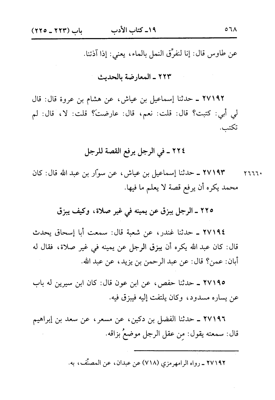 27194- حَدَّثَنَا غُنْدَرٌ ، عَنْ شُعْبَةَ ، قَالَ : سَمِعْتُ أَبَا إِسْحَاقَ يُحَدِّثُ قَالَ : كَانَ عَبْدُ اللهِ يَكْرَهُ أَنْ يَبْزُقَ الرَّجُلُ عَنْ يَمِينِهِ فِي غَيْرِ صَلاَةٍ ، فَقَالَ له أَبَانُ : عَمَّنْ ؟ فَقَالُ : عَنْ عَبْدِ الرَّحْمَنِ بْنِ يَزِيدَ ، عَنْ عَبْدِ اللهِ.