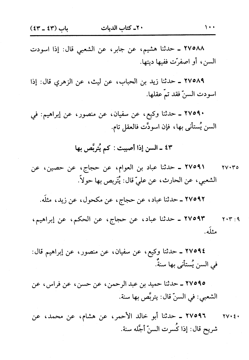 27596- حَدَّثَنَا أَبُو خَالِدٍ الأَحْمَرُ ، عَنْ هِشَامٍ ، عَنْ مُحَمَّدٍ ، عَنْ شُرَيْحٍ ، قَالَ : إِذَا كُسِرَتِ السِّنُّ أَجَّلَهُ سَنَةً. (9/203).