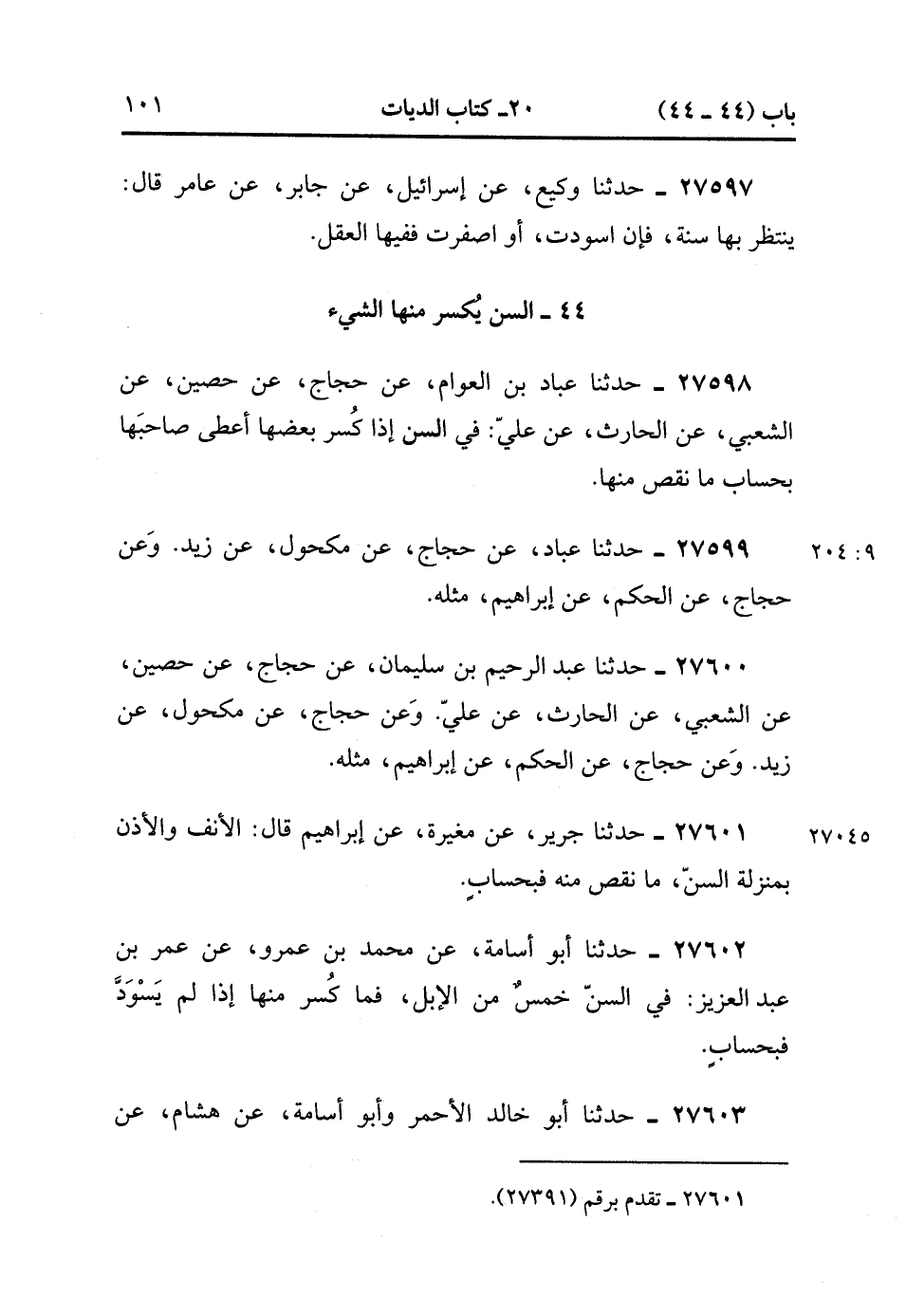 27598- حَدَّثَنَا عَبَّادُ بْنُ الْعَوَّامِ ، عَنْ حَجَّاجٍ ، عَنْ حُصَيْنٍ ، عَنِ الشَّعْبِيِّ ، عَنِ الْحَارِثِ ، عَنْ عَلِيٍّ ؛ فِي السِّنِّ إِذَا كُسِرَ بَعْضُهَا ، أُعْطَى صَاحِبُهَا بِحِسَابِ مَا نَقَصَ مِنْهَا. (9/203).