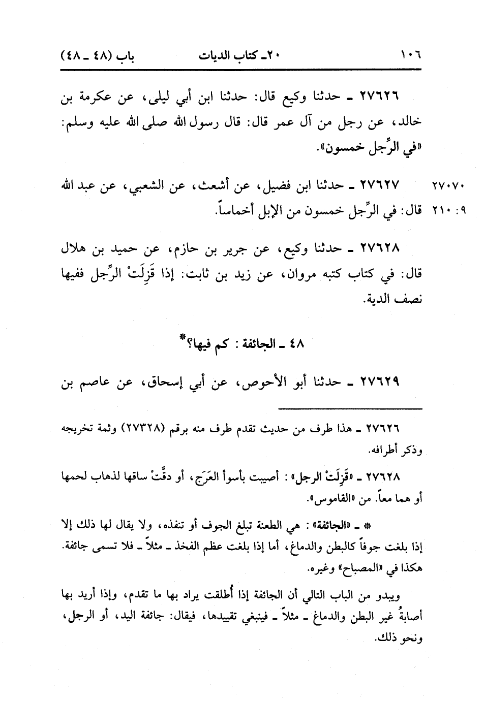 27629- حَدَّثَنَا أَبُو الأَحْوَصِ ، عَنْ أَبِي إِسْحَاقَ ، عَنْ عَاصِمِ بْنِ ضَمْرَةَ ، عَنْ عَلِيٍّ ، قَالَ : فِي الْجَائِفَةِ ثُلُثُ الدِّيَةِ. (9/210).