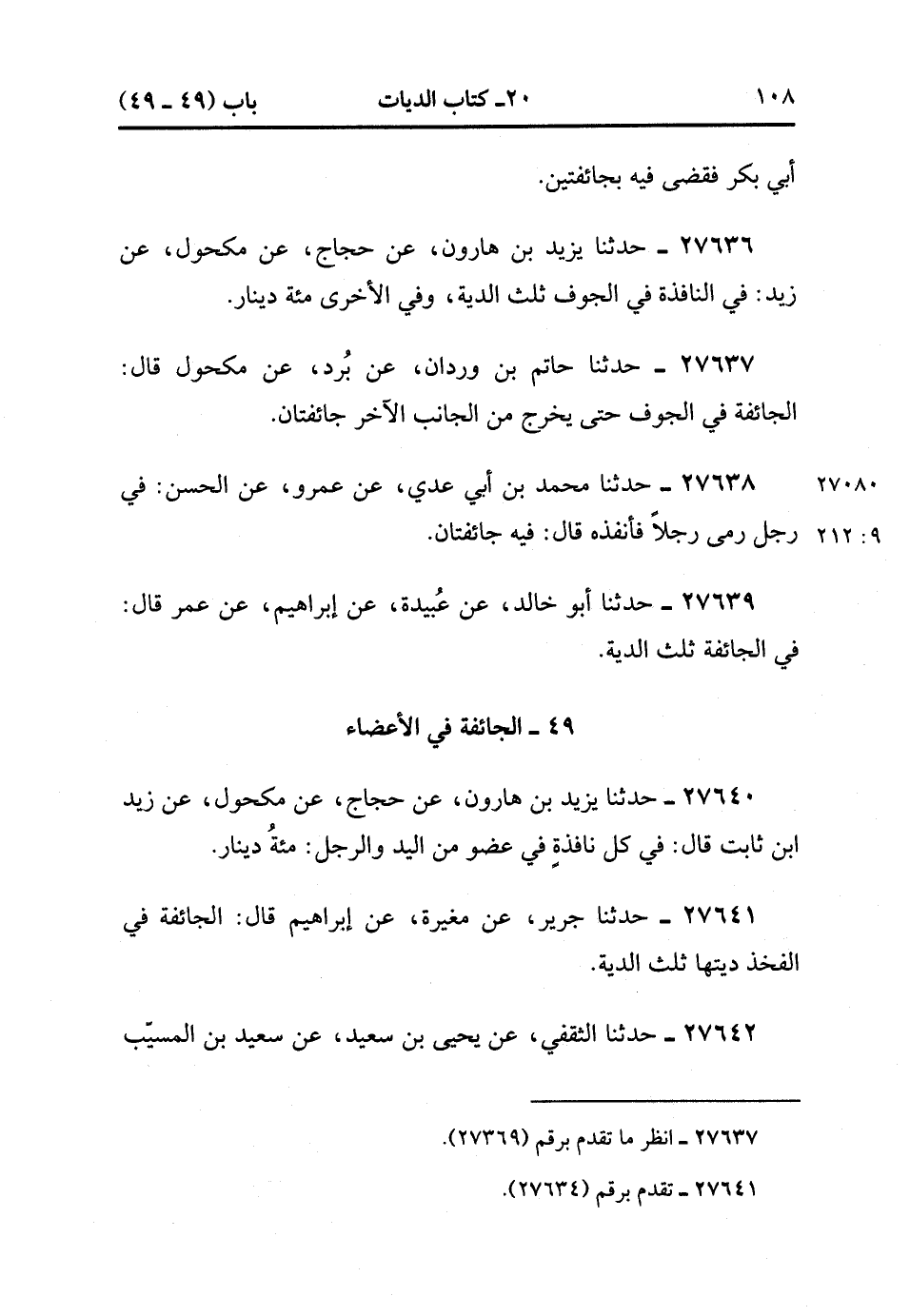 27638- حَدَّثَنَا مُحَمَّدُ بْنُ أَبِي عَدِيٍّ ، عَنْ عَمْرٍو ، عَنِ الْحَسَنِ ؛ فِي رَجُلٍ رَمَى رَجُلاً فَأَنْفَذَهُ قَالَ : فِيهِ جَائِفَتَانِ. (9/211).