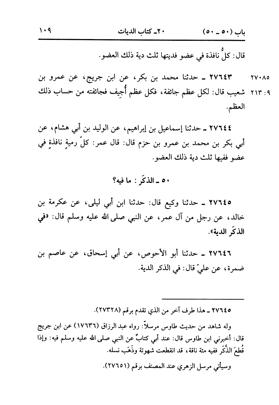 27646- حَدَّثَنَا أَبُو الأَحْوَصِ ، عَنْ أَبِي إِسْحَاقَ ، عَنْ عَاصِمِ بْنِ ضَمْرَةَ ، عَنْ عَلِيٍّ ، قَالَ : فِي الذَّكَرِ الدِّيَةُ. (9/213).