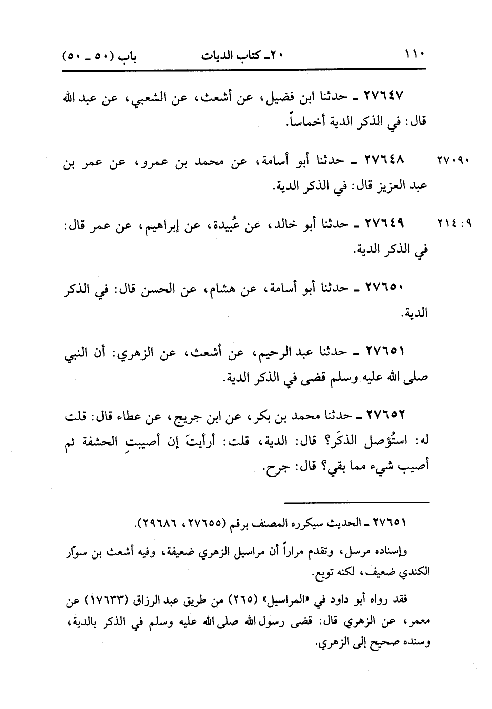 27648- حَدَّثَنَا أَبُو أُسَامَةَ ، عَنْ مُحَمَّدِ بْنِ عَمْرٍو ، عَنْ عُمَرَ بْنِ عَبْدِ الْعَزِيزِ ، قَالَ : فِي الذَّكَرِ الدِّيَةُ. (9/213).