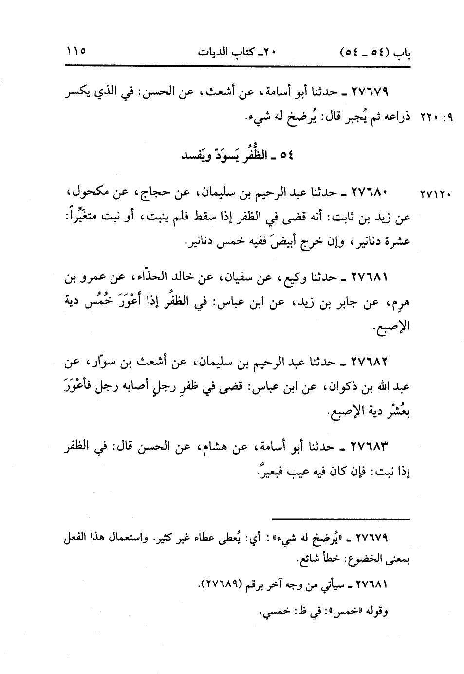 27680- حَدَّثَنَا عَبْدُ الرَّحِيمِ بْنُ سُلَيْمَانَ ، عَنْ حَجَّاجٍ ، عَنْ مَكْحُولٍ ، عَنْ زَيْدِ بْنِ ثَابِتٍ ؛ أَنَّهُ قَضَى فِي الظُّفْرِ إِذَا سَقَطَ فَلَمْ يَنْبُتْ ، أَوْ نَبَتَ مُتَغَيِّرًا : عَشَرَةَ دَنَانِيرَ ، وَإِنْ خَرَجَ أَبْيَضَ فَفِيهِ خَمْسَ دَنَانِيرَ.