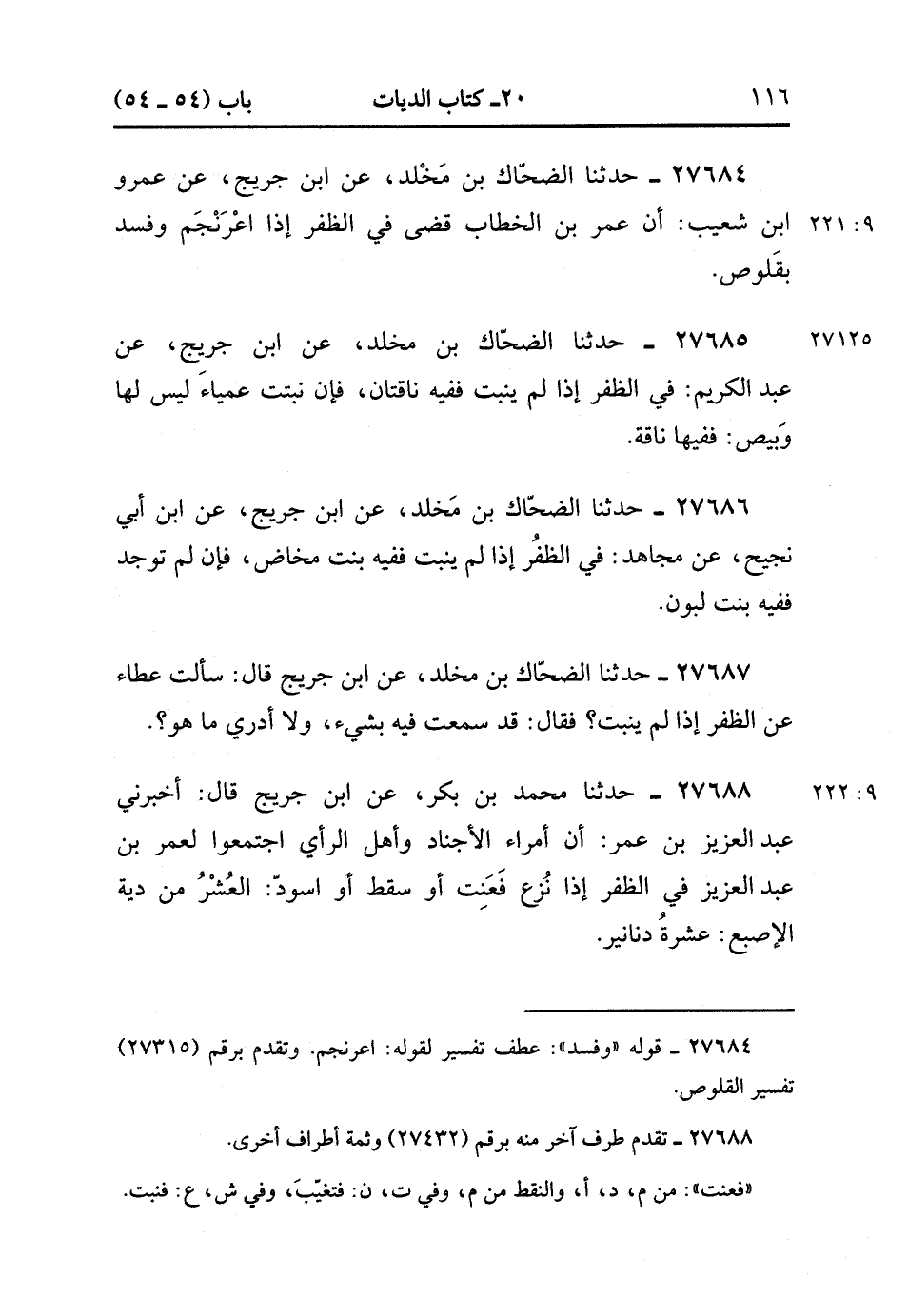27684- حَدَّثَنَا الضَّحَّاكُ بْنُ مَخْلَدٍ ، عَنِ ابْنِ جُرَيْجٍ ، عَنْ عَمْرِو بْنِ شُعَيْبٍ ؛ أَنَّ عُمَرَ بْنَ الْخَطَّابِ قَضَى فِي الظُّفْرِ إِذَا اعْرَنْجَمَ وَفَسَدَ بِقُلُوصٍ. (9/220).