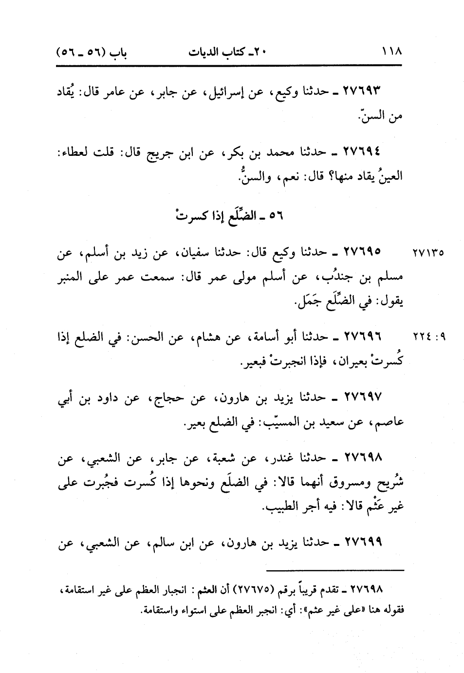 27695- حَدَّثَنَا وَكِيعٌ , قَالَ : حدَّثَنَا سُفْيَانُ ، عَنْ زَيْدِ بْنِ أَسْلَمَ ، عَنْ مُسْلِمِ بْنِ جُنْدُبٍ ، عَنْ أَسْلَمَ مَوْلَى عُمَرَ ، قَالَ : سَمِعْتُ عُمَرَ عَلَى الْمِنْبَرِ يَقُولُ : فِي الضِّلَعِ جَمَلٌ. (9/223).