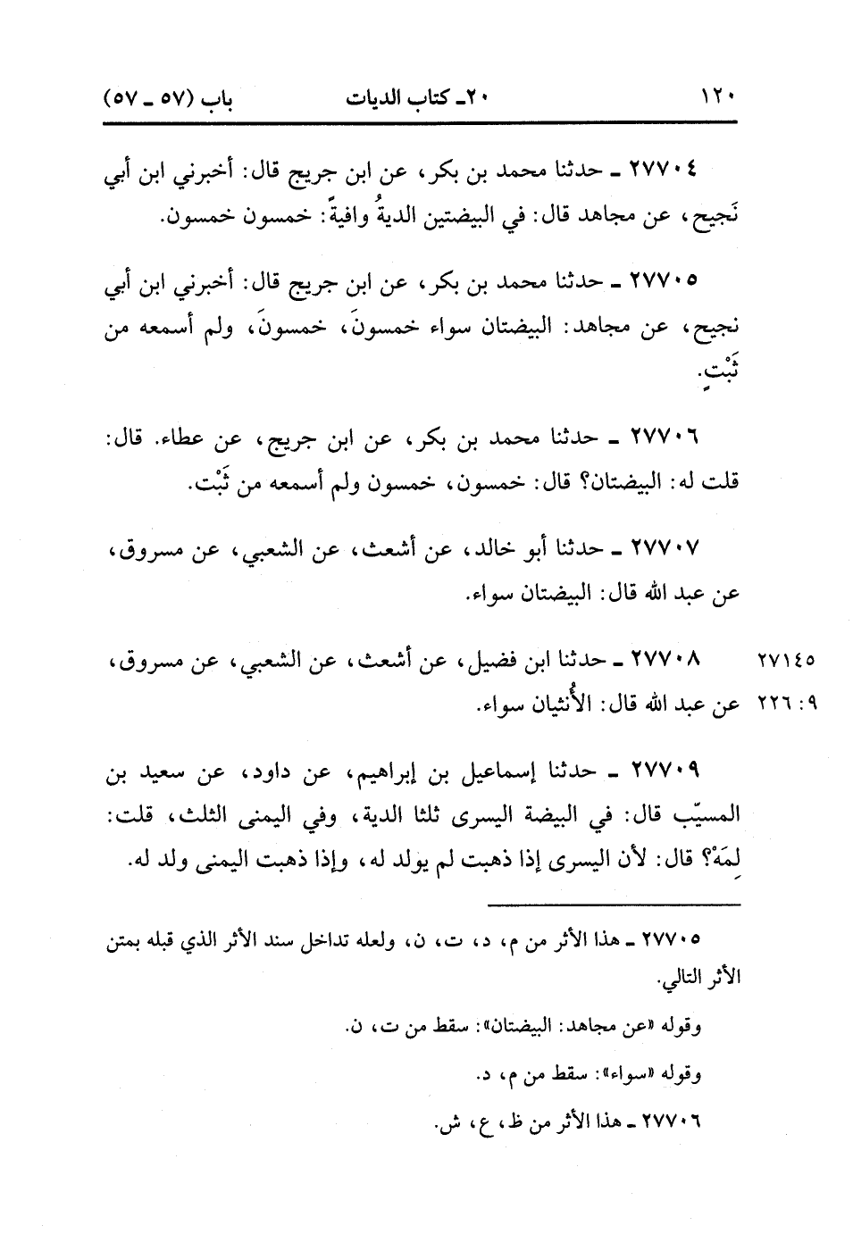 27704- حَدَّثَنَا مُحَمَّدُ بْنُ بَكْرٍ ، عَنِ ابْنِ جُرَيْجٍ ، قَالَ : أَخْبَرَنِي ابْنُ أَبِي نَجِيحٍ ، عَنْ مُجَاهِدٍ ، قَالَ : فِي الْبَيْضَتَيْنِ الدِّيَةُ وَافِيَةً ، خَمْسُونَ خَمْسُونَ.