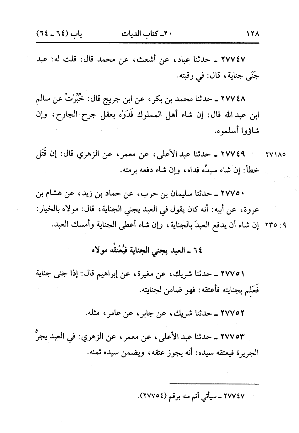 27750- حَدَّثَنَا سُلَيْمَانُ بْنُ حَرْبٍ ، عَنْ حَمَّادِ بْنِ زَيْدٍ ، عَنْ هِشَامِ بْنِ عُرْوَةَ ، عَنْ أَبِيهِ ؛ أَنَّهُ كَانَ يَقُولُ فِي الْعَبْدِ يَجْنِي الْجِنَايَةَ ، قَالَ : مَوْلاَهُ بِالْخِيَارِ ؛ إِنْ شَاءَ أَنْ يَدْفَعَ الْعَبْدَ بِالْجِنَايَةِ ، وَإِنْ شَاءَ أَعْطَى الْجِنَايَةَ ، وَأَمْسَكَ الْعَبْدَ. (9/234).