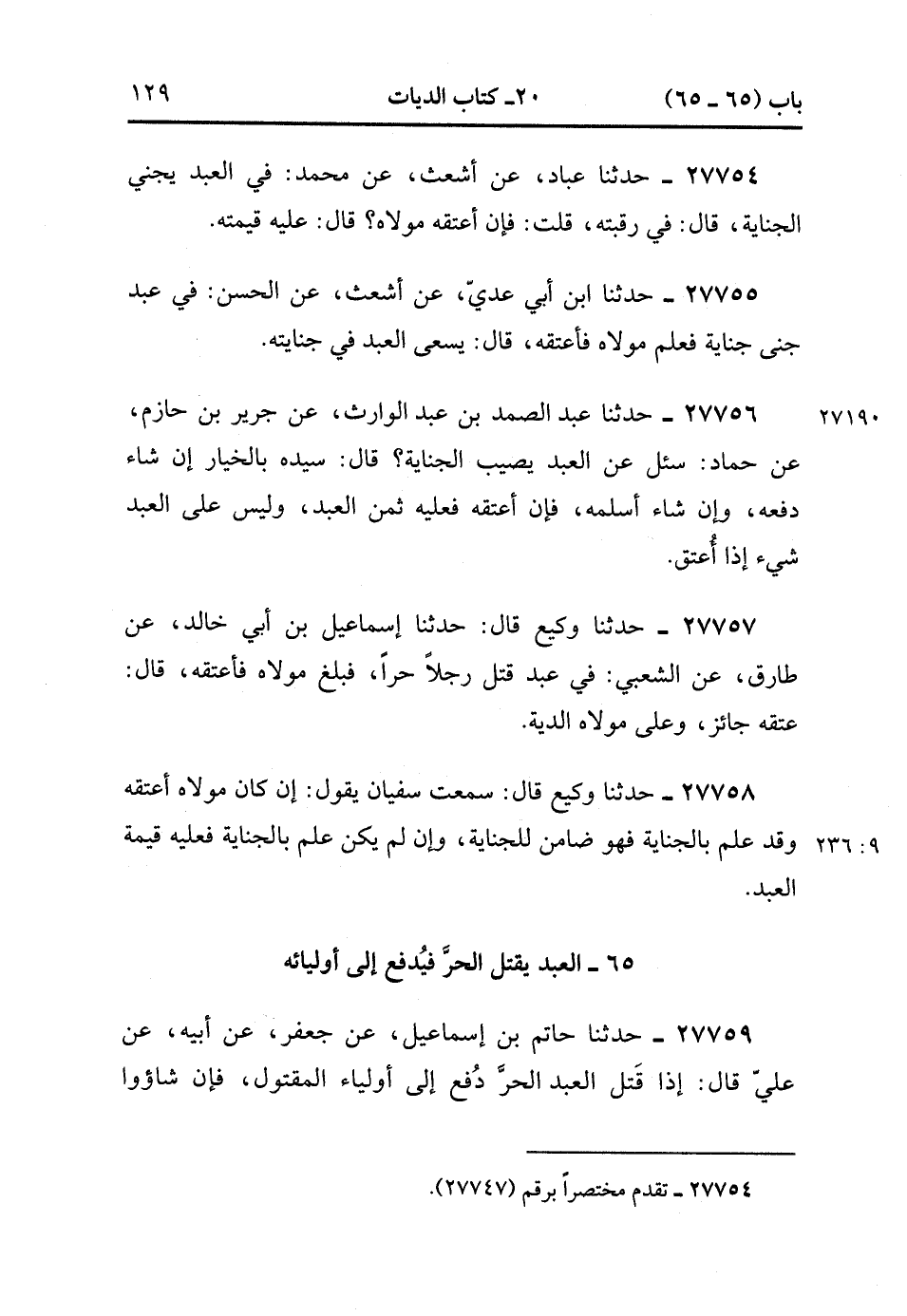 27759- حَدَّثَنَا حَاتِمُ بْنُ إِسْمَاعِيلَ ، عَنْ جَعْفَرٍ ، عَنْ أَبِيهِ ، عَنْ عَلِيٍّ قَالَ : إِذَا قَتَلَ الْعَبْدُ الْحُرَّ دُفِعَ إِلَى أَوْلِيَاءِ الْمَقْتُولِ ، فَإِنْ شَاؤُوا قَتَلُوهُ ، وَإِنْ شَاؤُوا اسْتَحْيَوْهُ. (9/236).