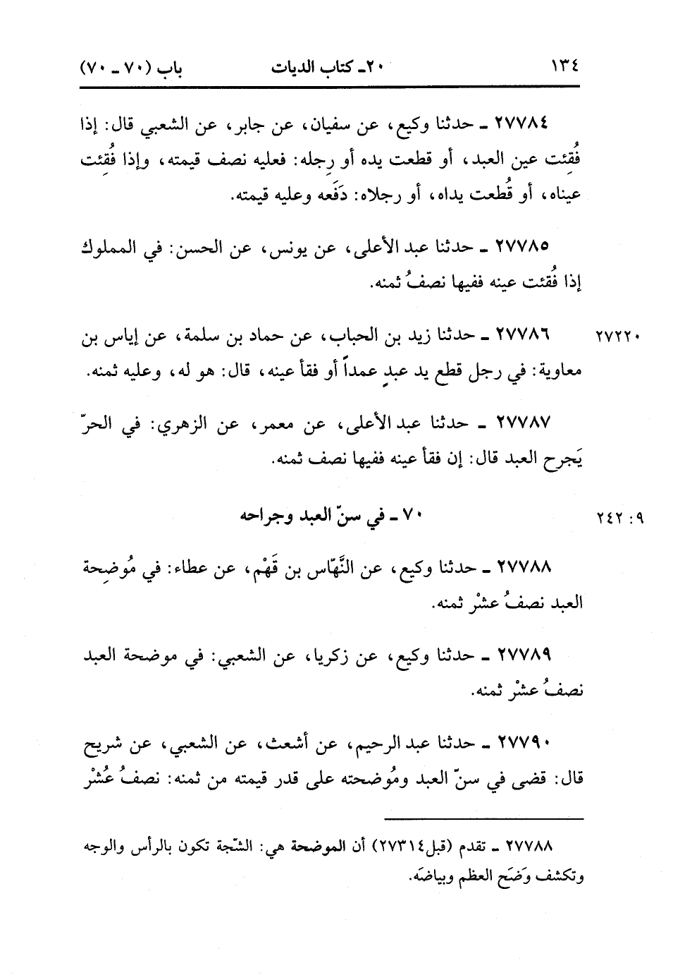 27790- حَدَّثَنَا عَبْدُ الرَّحِيمِ ، عَنْ أَشْعَثَ ، عَنِ الشَّعْبِيِّ ، عَنْ شُرَيْحٍ ، قَالَ : قضَى فِي سِنِّ الْعَبْدِ وَمُوضِحَتِهِ عَلَى قَدْرِ قِيمَتِهِ مِنْ ثَمَنِهِ ؛ نِصْفُ عُشْرِ قِيمَتِهِ ، كَنَحْوٍ مِنْ دِيَةِ الْحُرِّ فِي السِّنِّ وَالْمُوضِحَةِ. (9/242).