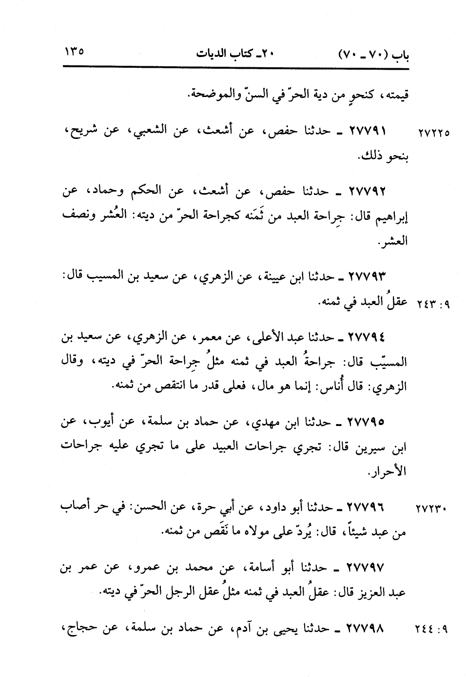 27795- حَدَّثَنَا ابْنُ مَهْدِيٍّ ، عَنْ حَمَّادِ بْنِ سَلَمَةَ ، عَنْ أَيُّوبَ ، عَنِ ابْنِ سِيرِينَ ، قَالَ : تَجْرِي جِرَاحَاتُ الْعَبِيدِ عَلَى مَا تَجْرِي عَلَيْهِ جِرَاحَاتُ الأَحْرَارِ.
