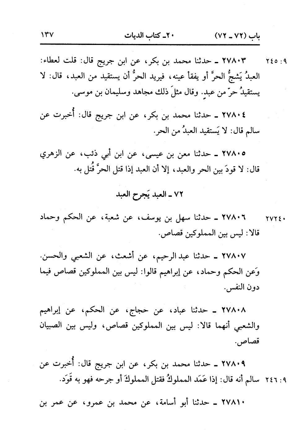 27803- حَدَّثَنَا مُحَمَّدُ بْنُ بَكْرٍ ، عَنِ ابْنِ جُرَيْجٍ ، قَالَ : قُلْتُ لِعَطَاءٍ : الْعَبْدُ يَشُجُّ الْحُرَّ ، أَوْ يَفْقَأُ عَيْنَهُ ، فَيُرِيدُ الْحُرُّ أَنْ يَسْتَقِيدَ مِنَ الْعَبْدِ ، قَالَ : لاَ يَسْتَقِيدُ حُرٌّ مِنْ عَبْدٍ ، وَقَالَ مِثْلَ ذَلِكَ مُجَاهِدٌ ، وَسُلَيْمَانُ بْنُ مُوسَى. (9/244).