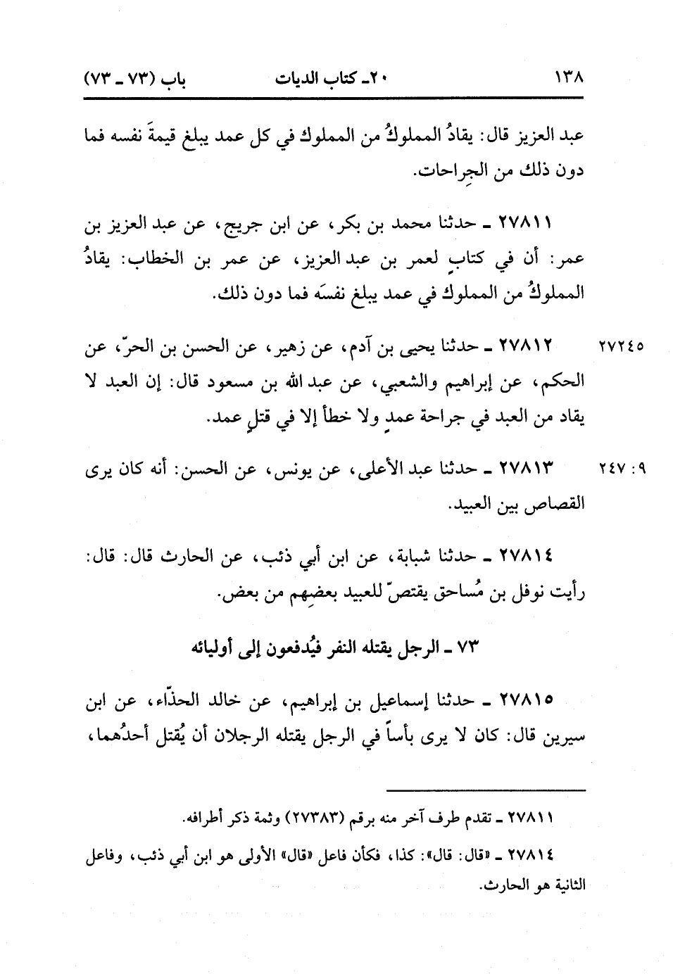 27813- حَدَّثَنَا عَبْدُ الأَعْلَى ، عَنْ يُونُسَ ، عَنِ الْحَسَنِ ؛ أَنَّهُ كَانَ يَرَى الْقِصَاصَ بَيْنَ الْعَبِيدِ. (9/246).