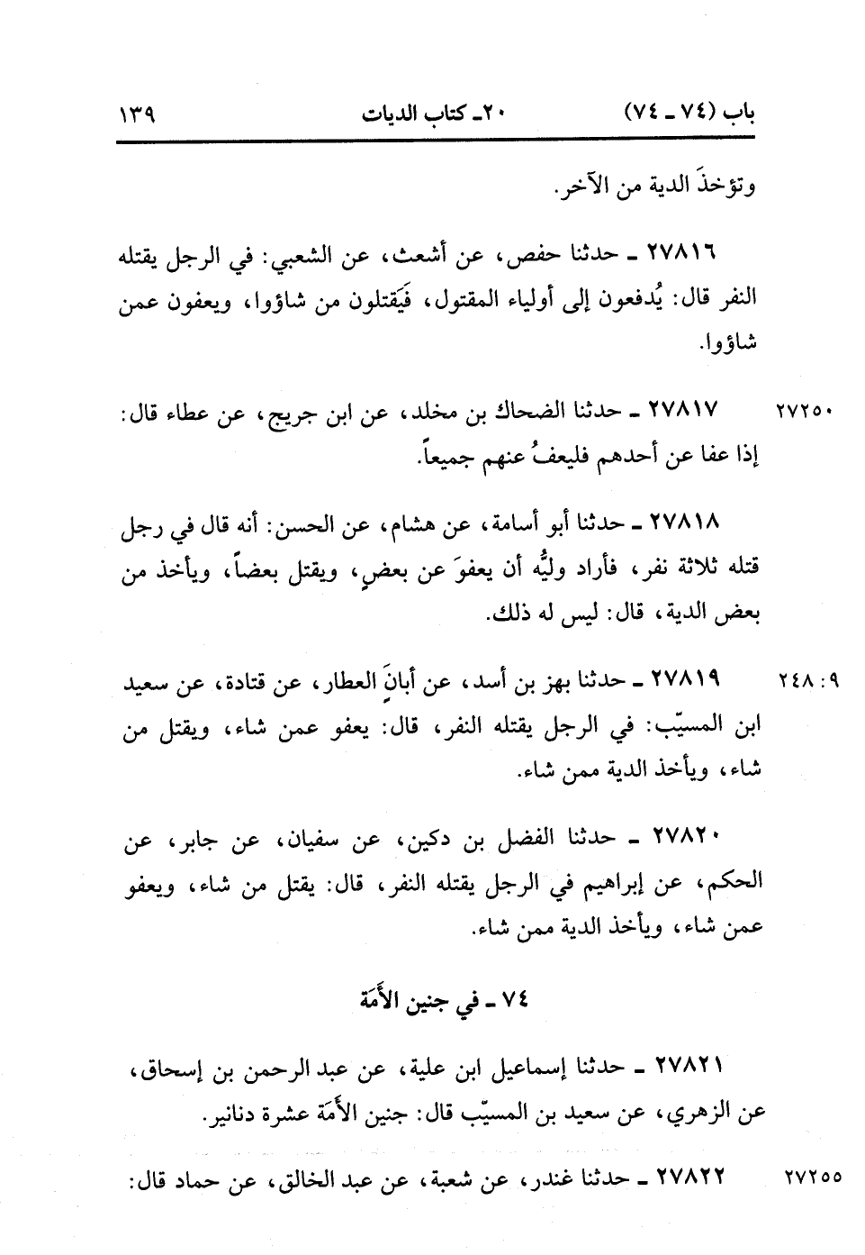 27818- حَدَّثَنَا أَبُو أُسَامَةَ ، عَنْ هِشَامٍ ، عَنِ الْحَسَنِ ؛ أَنَّهُ قَالَ فِي رَجُلٍ قَتَلَهُ ثَلاَثَةُ نَفَرٍ ، فَأَرَادَ وَلِيَّهُ أَنْ يَعْفُوَ عَنْ بَعْضٍ وَيَقْتُلَ بَعْضًا ، وَيَأْخُذَ مِنْ بَعْضٍ الدِّيَةَ ، قَالَ : لَيْسَ لَهُ ذَلِكَ. (9/247).