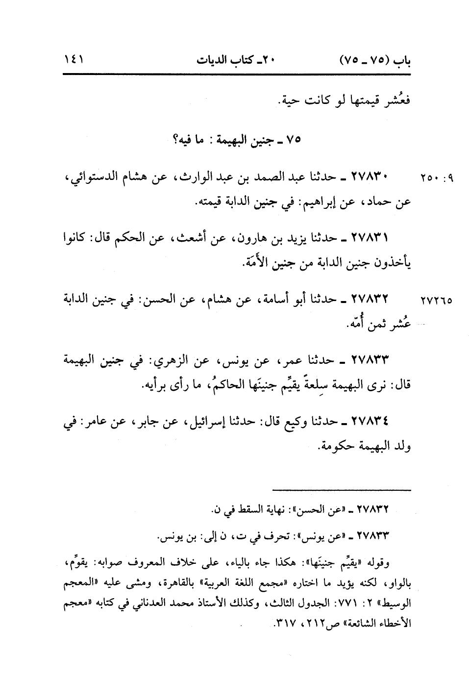 27830- حَدَّثَنَا عَبْدُ الصَّمَدِ بْنُ عَبْدِ الْوَارِثِ ، عَنْ هِشَامٍ الدَّسْتُوَائِيِّ ، عَنْ حَمَّادٍ ، عَنْ إِبْرَاهِيمَ ؛ فِي جَنِينِ الدَّابَّةِ قِيمَتُهُ. (9/249).
