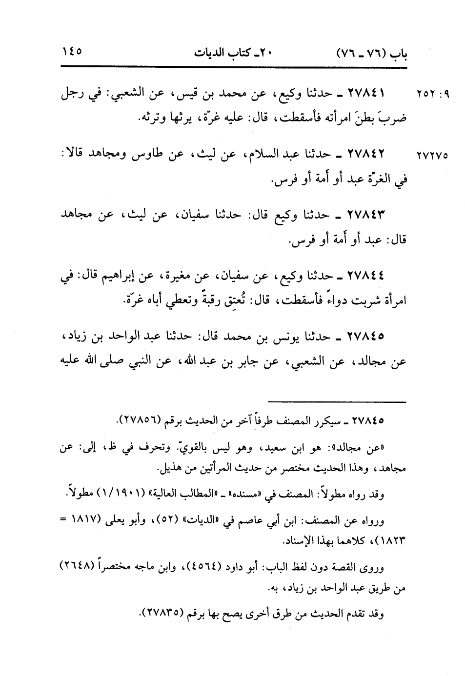 27845- حَدَّثَنَا يُونُسُ بْنُ مُحَمَّدٍ , قَالَ : حدَّثَنَا عَبْدُ الْوَاحِدِ بْنُ زِيَادٍ ، عَنْ مُجَالِدٍ ، عَنِ الشَّعْبِيِّ ، عَنْ جَابِرِ بْنِ عَبْدِ اللهِ ، عَنِ النَّبِيِّ صَلَّى الله عَلَيْهِ وَسَلَّمَ ؛ أَنَّهُ قَالَ : فِي الْغُرَّةِ عَبْدٌ ، أَوْ أَمَةٌ. (9/252).