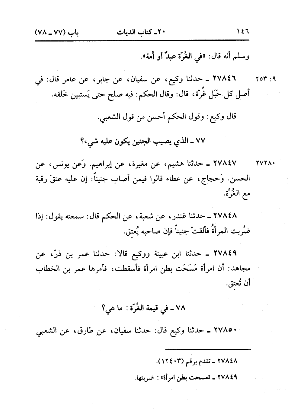 27850- حَدَّثَنَا وَكِيعٌ , قَالَ : حدَّثَنَا سُفْيَانُ ، عَنْ طَارِقٍ ، عَنِ الشَّعْبِيِّ ، قَالَ : الْغُرَّةُ خَمْسُ مِئَةٍ. (9/253).