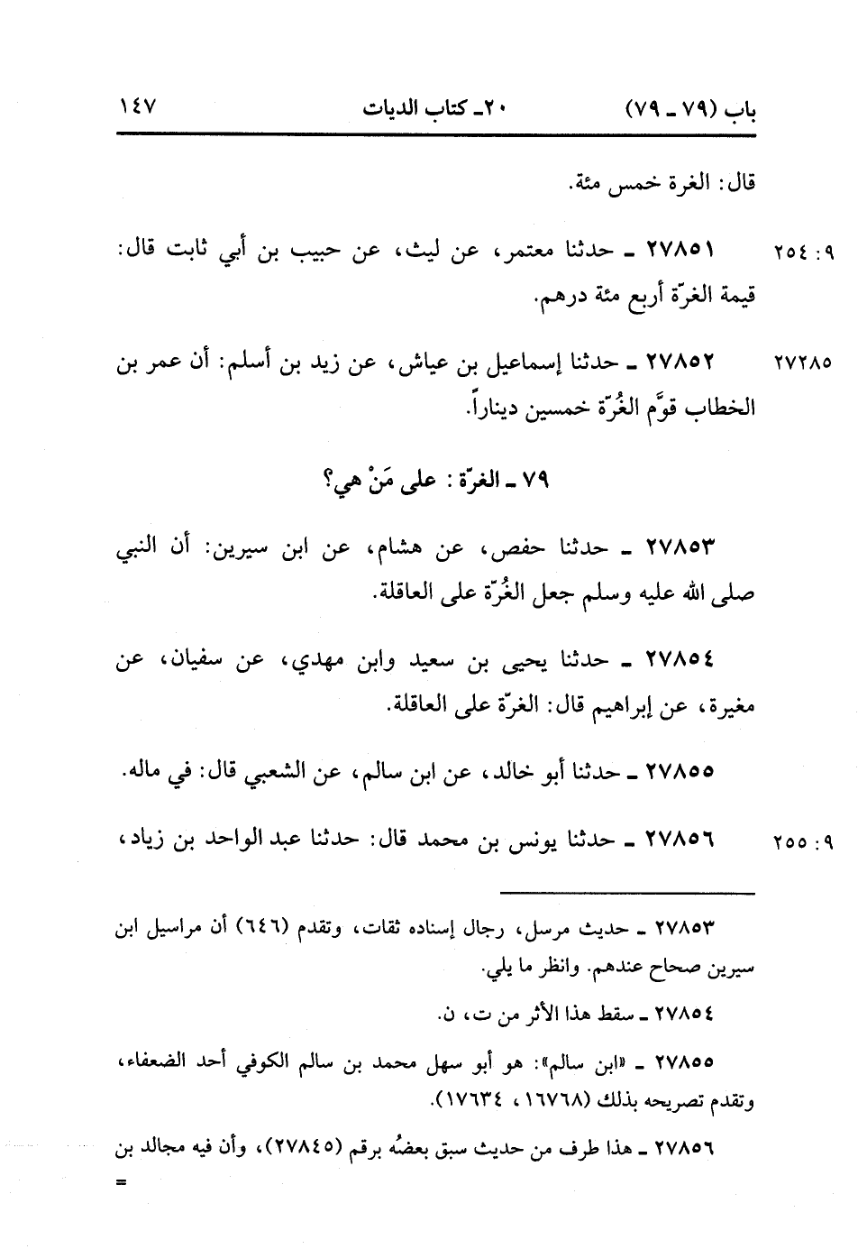 27853- حَدَّثَنَا حَفْصٌ ، عَنْ هِشَامٍ ، عَنِ ابْنِ سِيرِينَ ؛ أَنَّ النَّبِيَّ صَلَّى الله عَلَيْهِ وَسَلَّمَ جَعَلَ الْغُرَّةَ عَلَى الْعَاقِلَةِ.
