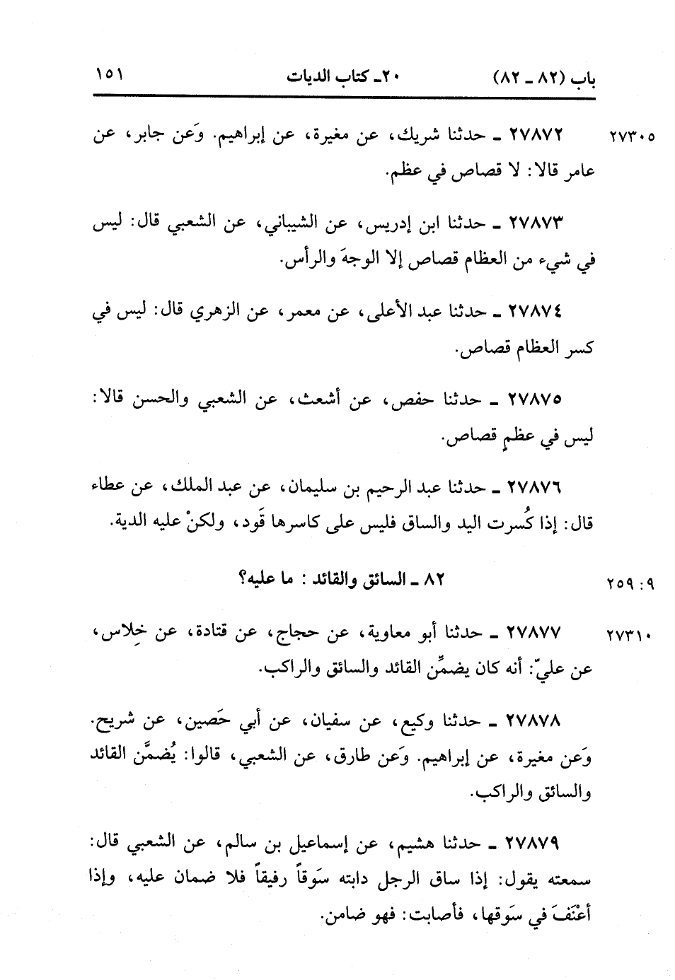 27873- حَدَّثَنَا ابْنُ إِدْرِيسَ ، عَنِ الشَّيْبَانِيِّ ، عَنِ الشَّعْبِيِّ ، قَالَ : لَيْسَ فِي شَيْءٍ مِنَ الْعِظَامِ قِصَاصٌ ، إِلاَّ الْوَجْهَ وَالرَّأْسَ.