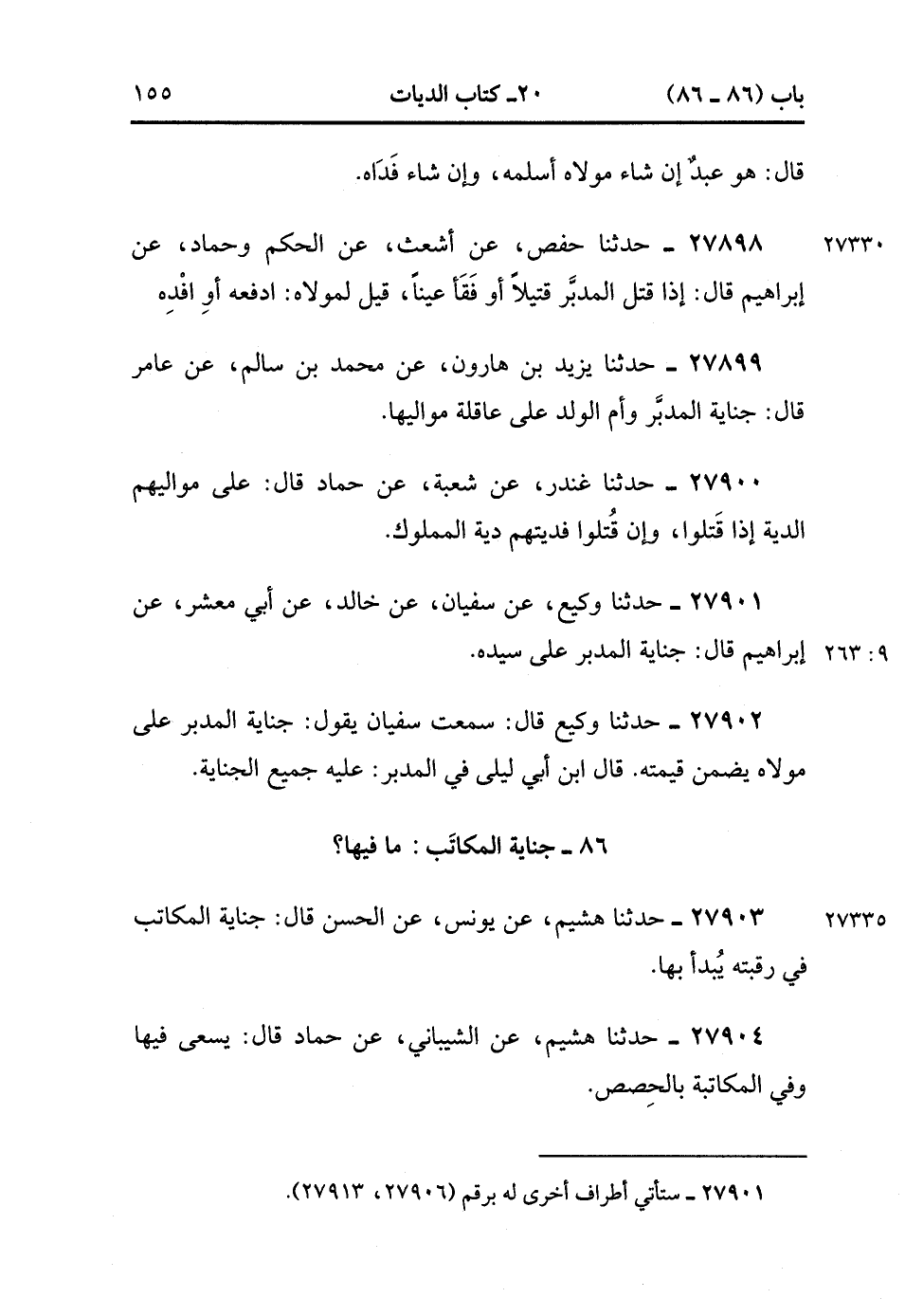 27901- حَدَّثَنَا وَكِيعٌ ، عَنْ سُفْيَانَ ، عَنْ خَالِدٍ ، عَنْ أَبِي مَعْشَرٍ ، عَنْ إِبْرَاهِيمَ ، قَالَ : جِنَايَةُ الْمُدَبَّرِ عَلَى سَيِّدِهِ. (9/262).