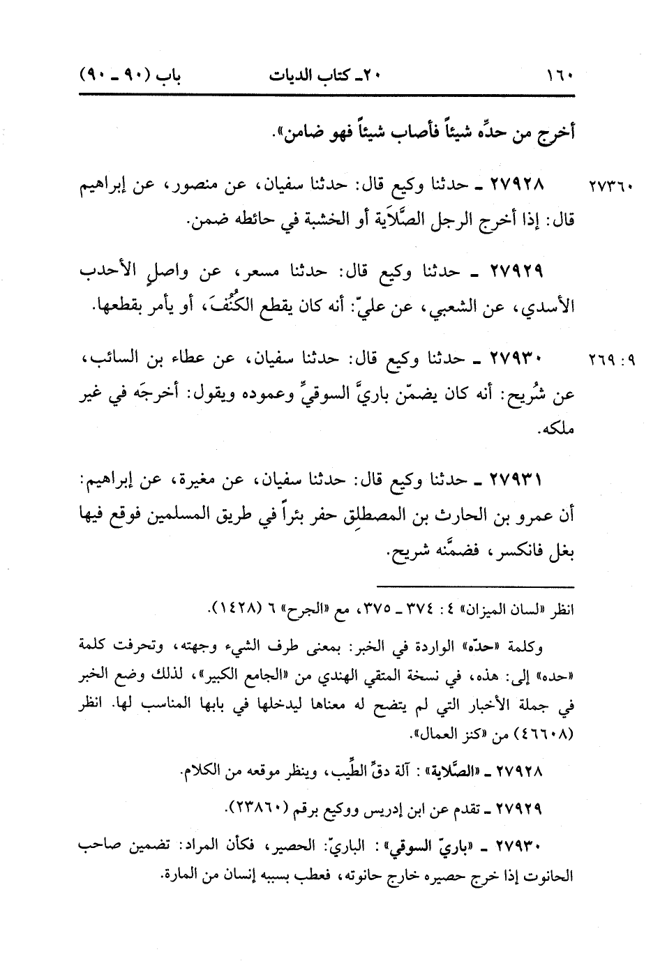 27931- حَدَّثَنَا وَكِيعٌ , قَالَ : حدَّثَنَا سُفْيَانُ ، عَنْ مُغِيرَةَ ، عَنْ إِبْرَاهِيمَ ؛ أَنَّ عَمْرَو بْنَ الْحَارِثِ بْنِ الْمُصْطَلِقِ حَفَرَ بِئْرًا فِي طَرِيقِ الْمُسْلِمِينَ ، فَوَقَعَ فِيهَا بَغْلٌ فَانْكَسَرَ ، فَضَمَّنَهُ شُرَيْحٌ. (9/269).