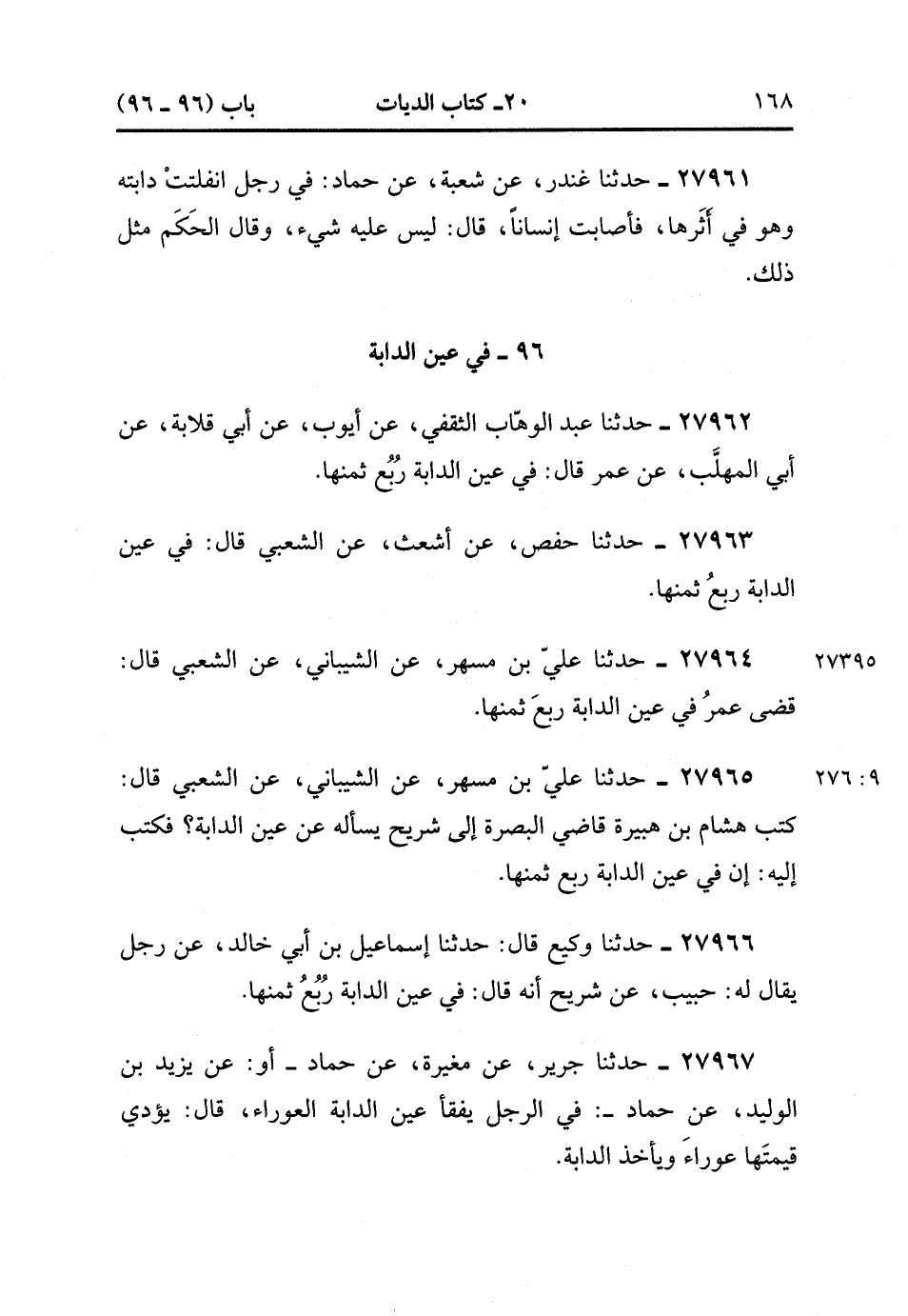 27964- حَدَّثَنَا عَلِيُّ بْنُ مُسْهِرٍ ، عَنِ الشَّيْبَانِيِّ ، عَنِ الشَّعْبِيِّ قَالَ : قضَى عُمَرُ فِي عَيْنِ الدَّابَّةِ ِرُبُعَ ثَمَنِهَا. (9/275).