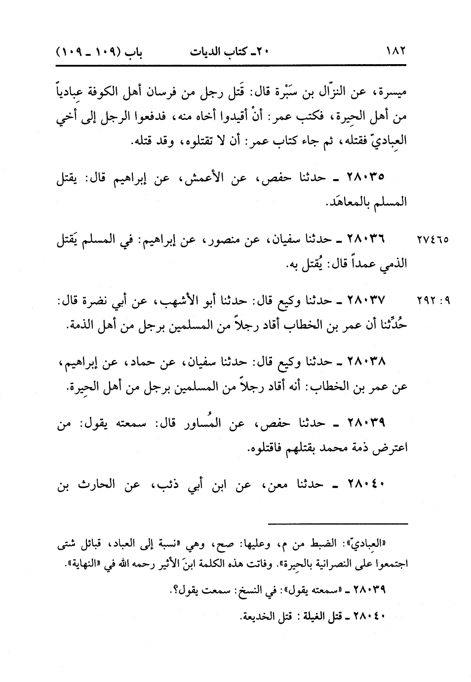 28038- حَدَّثَنَا وَكِيعٌ , قَالَ : حدَّثَنَا سُفْيَانُ ، عَنْ حَمَّادٍ ، عَنْ إِبْرَاهِيمَ ، عَنْ عُمَرَ بْنَ الْخَطَّابِ ؛ أَنَّهُ أَقَادَ رَجُلاً مِنَ الْمُسْلِمِينَ بِرَجُلٍ مِنْ أَهْلِ الْحِيرَةِ.