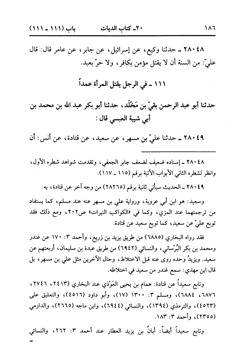 28048- حَدَّثَنَا وَكِيعٌ ، عَنْ إِسْرَائِيلَ ، عَنْ جَابِرٍ ، عَنْ عَامِرٍ ، قَالَ : قَالَ عَلِيٌّ : مِنَ السُّنَّةِ أَنْ لاَ يُقْتَلَ مُؤْمِنٌ بِكَافِرٍ ، وَلاَ حُرٌّ بِعَبْدٍ.