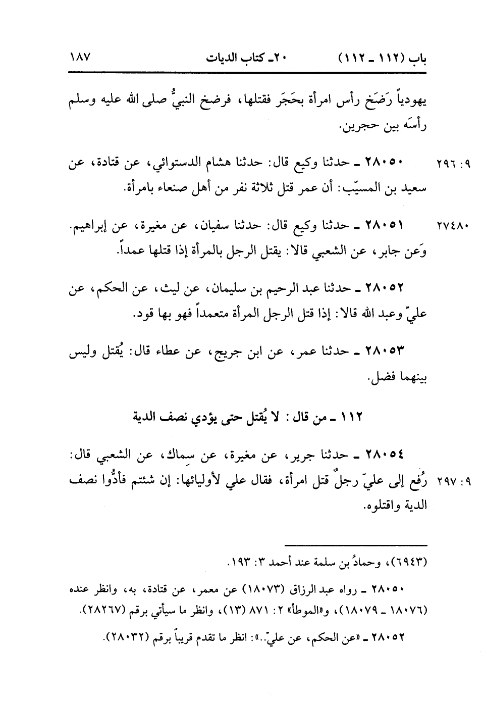 28054- حَدَّثَنَا جَرِيرٌ ، عَنْ مُغِيرَةَ ، عَنْ سِمَاكٍ ، عَنِ الشَّعْبِيِّ ، قَالَ : رُفِعَ إِلَى علِيٍّ رَجُلٌ قَتَلَ امْرَأَةً ، فَقَالَ عَلِيٌّ لأَوْلِيَائِهَا : إِنْ شِئْتُمْ فَأَدُّوا نِصْفَ الدِّيَةِ وَاقْتُلُوهُ. (9/296).