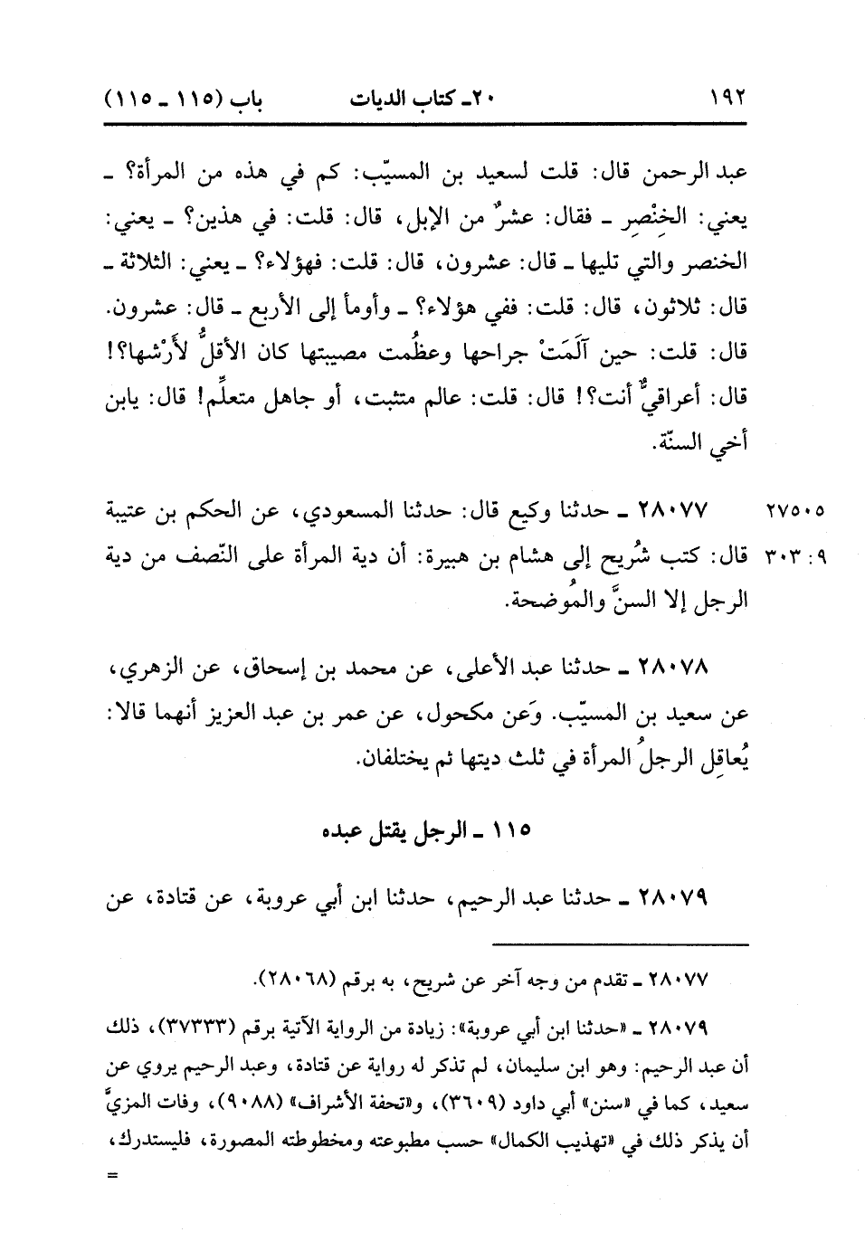 28078- حَدَّثَنَا عَبْدُ الأَعْلَى ، عَنْ مُحَمَّدِ بْنِ إِسْحَاقَ ، عَنِ الزُّهْرِيِّ ، عَنْ سَعِيدِ بْنِ الْمُسَيَّبِ (ح) وَعَنْ مَكْحُولٍ ، عَنْ عُمَرَ بْنِ عَبْدِ الْعَزِيزِ ؛ أَنَّهُمَا قَالاَ : يُعَاقِلُ الرَّجُلُ الْمَرْأَةَ فِي ثُلُثِ دِيَتِهَا ، ثُمَّ يَخْتَلِفَانِ. (9/303).