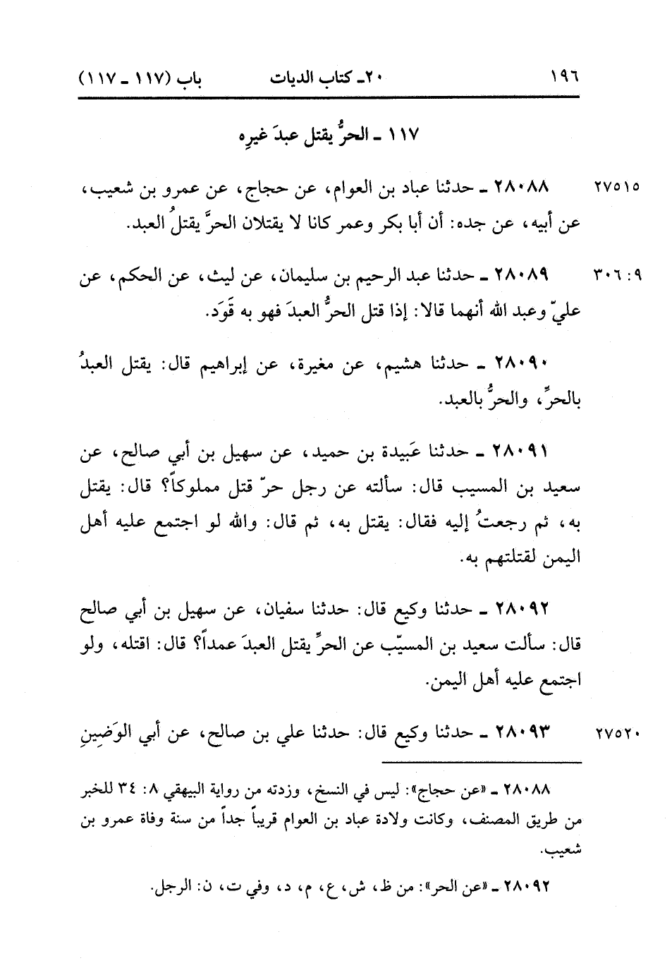 28089- حَدَّثَنَا عَبْدُ الرَّحِيمِ بْنُ سُلَيْمَانَ ، عَنْ لَيْثٍ ، عَنِ الْحَكَمِ ، عَنْ عَلِيٍّ ، وَعَبْدِ اللهِ ، أَنَّهُمَا قَالاَ : إِذَا قَتَلَ الْحُرُّ الْعَبْدَ ، فَهُوَ بِهِ قَود. (9/305).