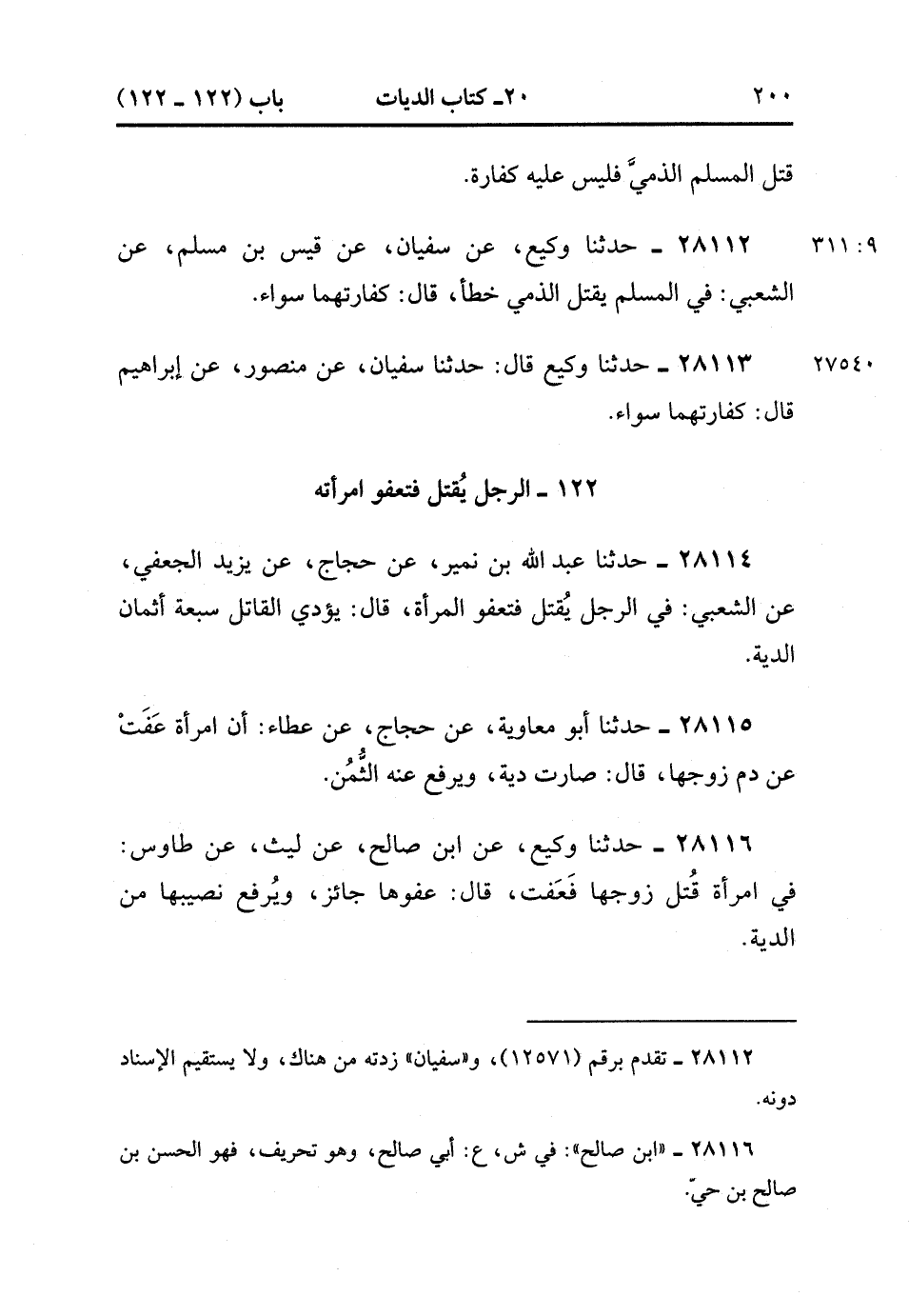 28116- حَدَّثَنَا وَكِيعٌ ، عَنِ ابْنِ صَالِحٍ ، عَنْ لَيْثٍ ، عَنْ طَاوُوسٍ ؛ فِي امْرَأَةٍ قُتِلَ زَوْجُهَا فَعَفَتْ ، قَالَ : عَفْوُهَا جَائِزٌ ، وَيُرْفَعُ نَصِيبُهَا مِنَ الدِّيَةِ. (9/311).