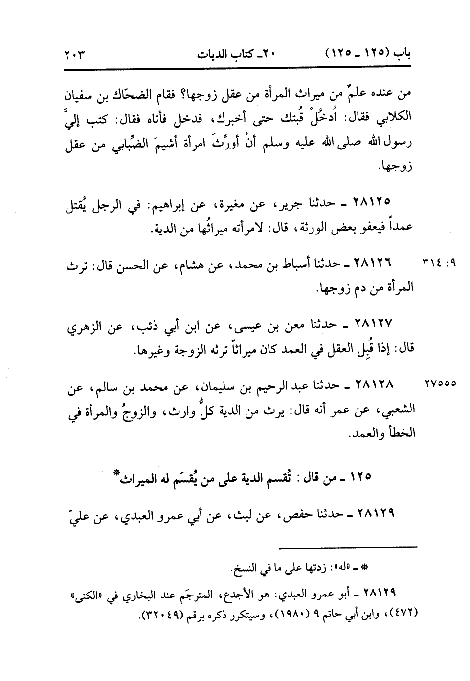 28128- حَدَّثَنَا عَبْدُ الرَّحِيمِ بْنُ سُلَيْمَانَ ، عَنْ مُحَمَّدِ بْنِ سَالِمٍ ، عَنِ الشَّعْبِيِّ ، عَنْ عُمَرَ ؛ أَنَّهُ قَالَ : يَرِثُ مِنَ الدِّيَةِ كُلُّ وَارِثٍ ، وَالزَّوْجُ وَالْمَرْأَةُ فِي الْخَطَأِ وَالْعَمْدِ. (9/314).