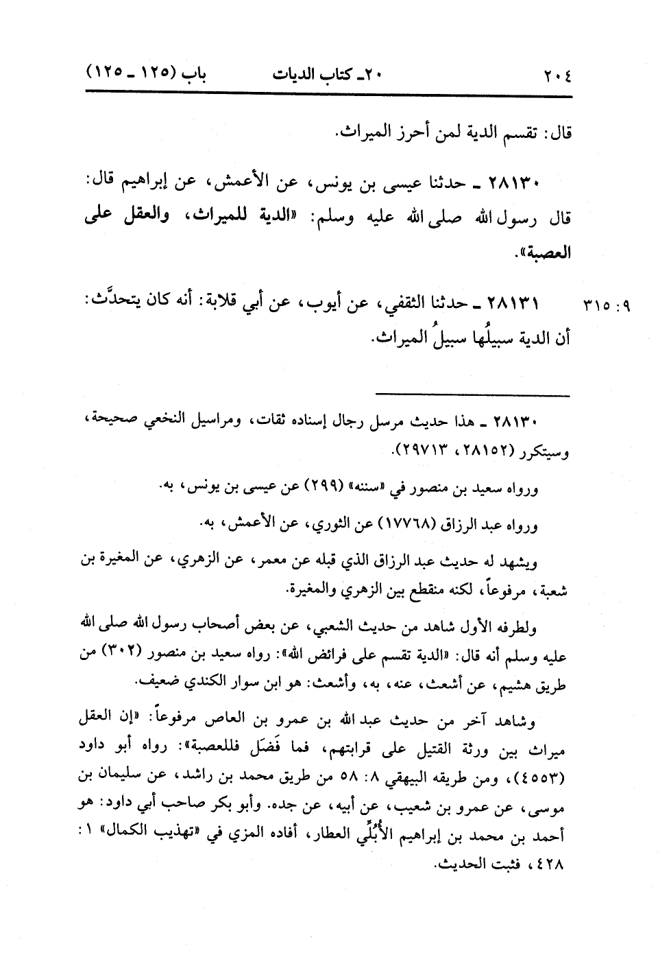 28130- حَدَّثَنَا عِيسَى بْنُ يُونُسَ ، عَنِ الأَعْمَشِ ، عَنْ إِبْرَاهِيمَ ، قَالَ : قَالَ رَسُولُ اللهِ صَلَّى الله عَلَيْهِ وَسَلَّمَ : الدِّيَةُ لِلْمِيرَاثِ ، وَالْعَقْلُ عَلَى الْعَصَبَةِ. (9/314).
