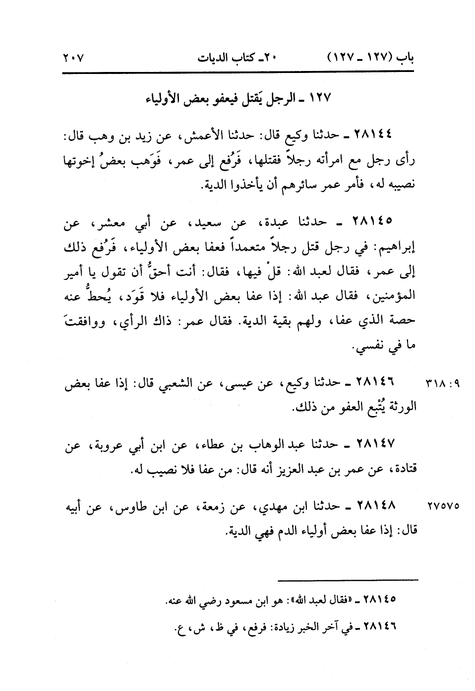 28145- حَدَّثَنَا عَبْدَةُ ، عَنْ سَعِيدٍ ، عَنْ أَبِي مَعْشَرٍ ، عَنْ إِبْرَاهِيمَ ؛ فِي رَجُلٍ قَتَلَ رَجُلاً مُتَعَمِّدًا ، فَعَفَا بَعْضُ الأَوْلِيَاءِ ، فَرُفِعَ ذَلِكَ إِلَى عُمَرَ ، فَقَالَ لِعَبْدِ اللهِ : قُلْ فِيهَا ، فَقَالَ : أَنْتَ أَحَقُّ أَنْ تَقُولَ يَا أَمِيرَ الْمُؤْمِنِينَ ، فَقَالَ عَبْدُ اللهِ : إِذَا عَفَا بَعْضُ الأَوْلِيَاءِ فَلاَ قَوَدَ ، يُحَطُّ عَنْهُ حِصَّةِ الَّذِي عَفَا ، وَلَهُمْ بَقِيَّةُ الدِّيَةِ ، فَقَالَ عُمَرُ : ذَاكَ الرَّأْيُ ، وَوَافَقْتَ مَا فِي نَفْسِي. (9/317).