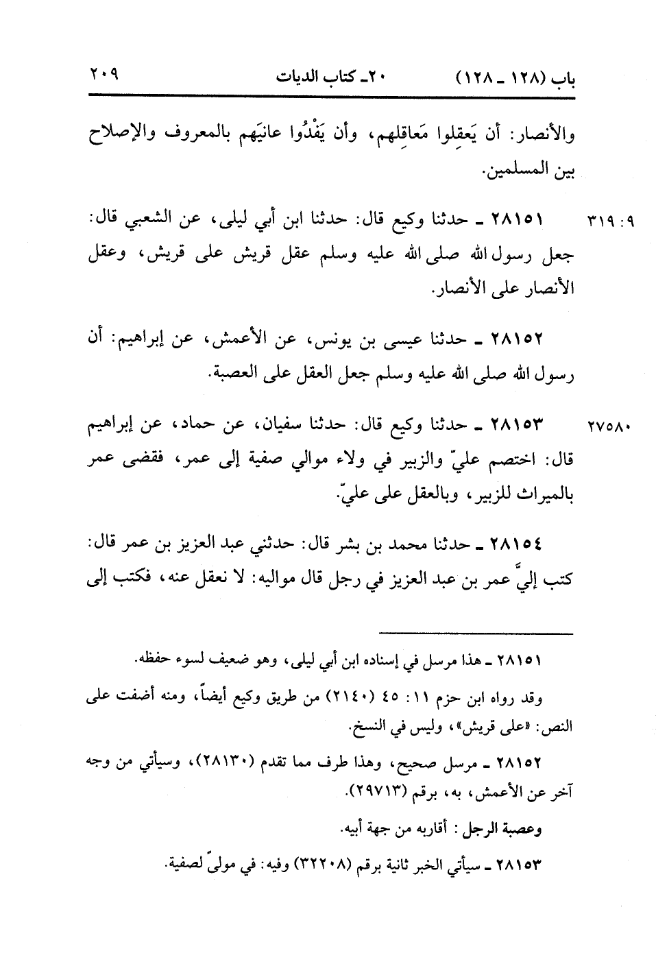 28152- حَدَّثَنَا عِيسَى بْنُ يُونُسَ ، عَنِ الأَعْمَشِ ، عَنْ إِبْرَاهِيمَ ؛ أَنَّ رَسُولَ اللهِ صَلَّى الله عَلَيْهِ وَسَلَّمَ جَعَلَ الْعَقْلَ عَلَى الْعَصَبَةِ.