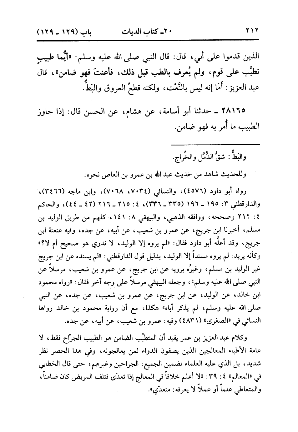 28164- حَدَّثَنَا حَفْصٌ ، عَنْ عَبْدِ الْعَزِيزِ بْنِ عُمَرَ ، قَالَ : حدَّثَنِي بَعْضُ الَّذِينَ قَدِمُوا عَلَى أَبِي ، قَالَ : قَالَ النَّبِيُّ صَلَّى الله عَلَيْهِ وَسَلَّمَ : أَيُّمَا طَبِيبٍ تَطَبَّبَ عَلَى قَوْمٍ ، وَلَمْ يُعْرَفْ بِالطِّبِّ قَبْلَ ذَلِكَ ، فَأَعَنتَ فَهُوَ ضَامِنٌ ، قَالَ عَبْدُ الْعَزِيزِ : أَمَّا إِنَّهُ لَيْسَ بِالنَّعْتِ ، وَلَكِنَّهُ قَطْعُ الْعُرُوقِ وَالْبَطُّ.
