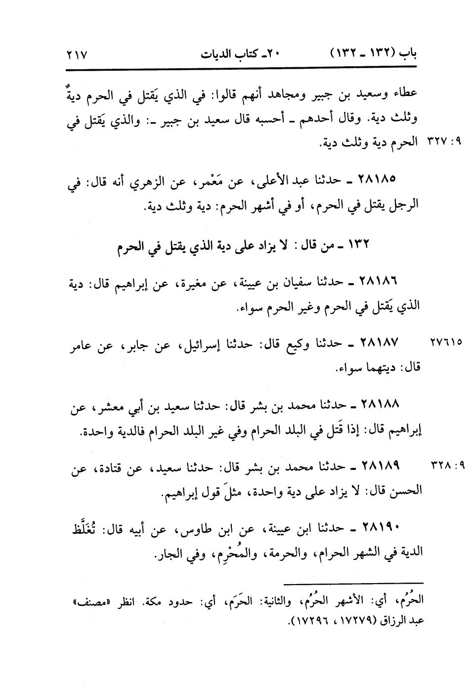 28190- حَدَّثَنَا ابْنُ عُيَيْنَةَ ، عَنِ ابْنِ طَاوُوسٍ ، عَنْ أَبِيهِ ، قَالَ : تُغْلَّظُ الدِّيَةُ فِي الشَّهْرِ الْحَرَامِ ، وَالْحُرْمَةِ ، وَالْمُحْرِمِ ، وَفِي الْجَارِ. (9/328).