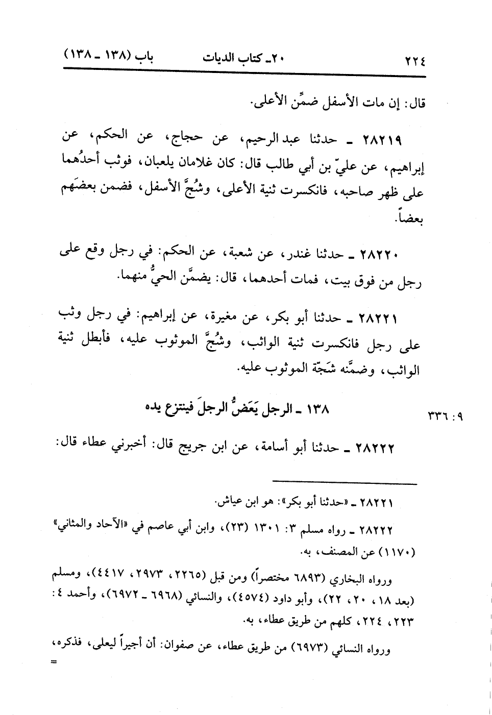 28221- حَدَّثَنَا أَبُو بَكْرٍ ، عَنْ مُغِيرَةَ ، عَنْ إِبْرَاهِيمَ ؛ فِي رَجُلٍ وَثَبَ عَلَى رَجُلٍ ، فَانْكَسَرَتْ ثَنِيَّةُ الْوَاثِبِ وَشُجَّ الْمَوْثُوبُ عَلَيْهِ ، فَأَبْطَلَ ثَنِيَّةَ الْوَاثِبِ ، وَضَمَّنَهُ شَجَّةَ الْمَوْثُوبِ عَلَيْهِ. (9/335).