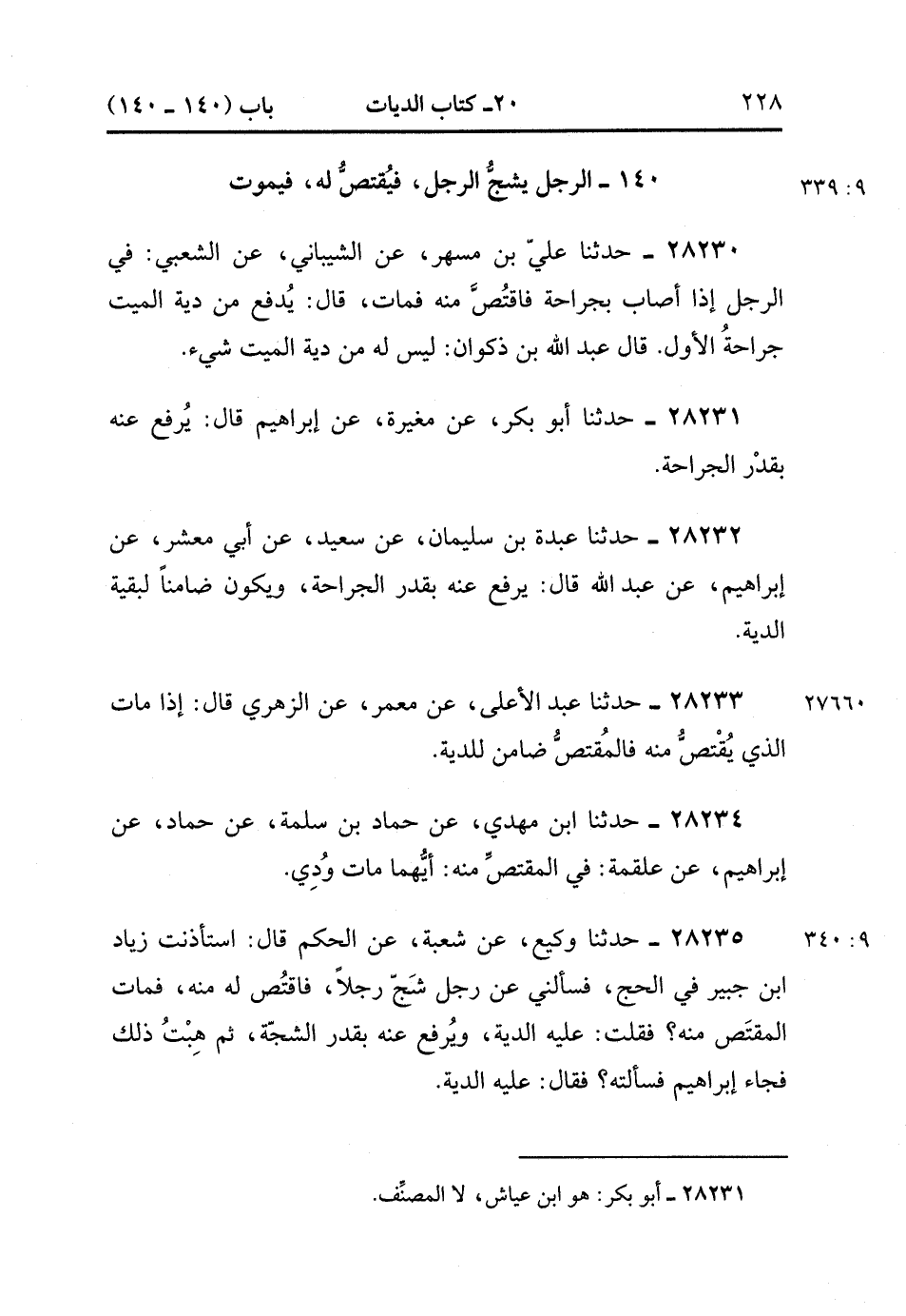 28235- حَدَّثَنَا وَكِيعٌ ، عَنْ شُعْبَةَ ، عَنِ الْحَكَمِ ، قَالَ : اسْتَأْذَنْتُ زِيَادَ بْنَ جُبَيْرٍ فِي الْحَجِّ ، فَسَأَلَنِي عَنْ رَجُلٍ شَجَّ رَجُلاً فَاقْتَصَّ لَهُ مِنْهُ ، فَمَاتَ الْمُقْتَصُّ مِنْهُ ؟ فَقُلْتُ : عَلَيْهِ الدِّيَةُ ، وَيُرْفَعُ عَنْهُ بِقَدْرِ الشَّجَّةِ ، ثُمَّ هِبْتُ ذَلِكَ فَجَاءَ إِبْرَاهِيمُ فَسَأَلْتُهُ ؟ فَقَالَ : عَلَيْهِ الدِّيَةُ. (9/339).