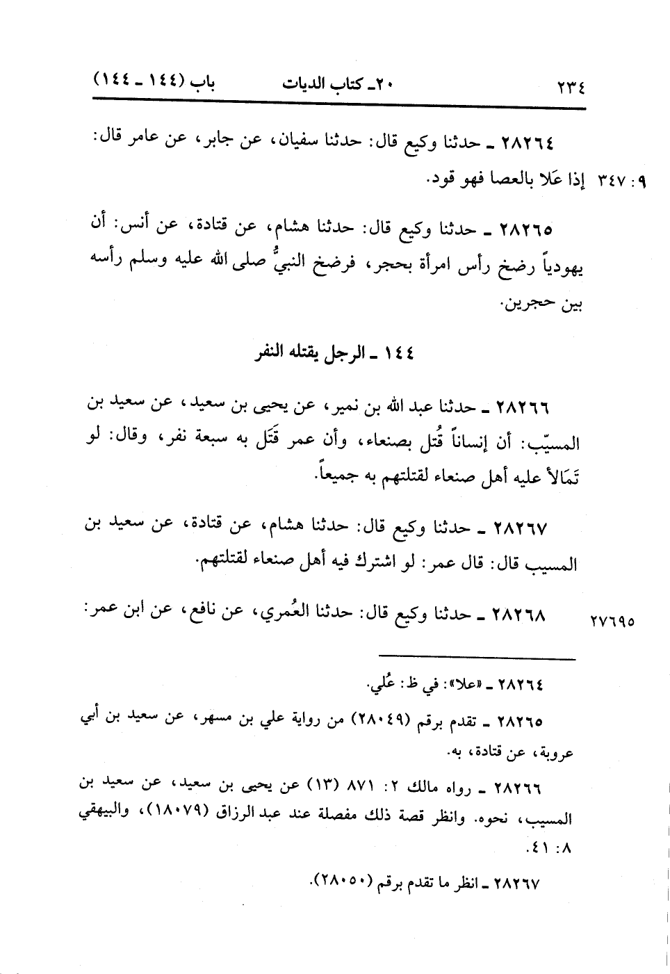 28268- حَدَّثَنَا وَكِيعٌ , قَالَ : حدَّثَنَا الْعُمَرِيُّ ، عَنْ نَافِعٍ ، عَنِ ابْنِ عُمَرَ ؛ أَنَّ عُمَرَ بْنَ الْخَطَّابِ قَتَلَ سَبْعَةً مِنْ أَهْلِ صَنْعَاءَ بِرَجُلٍ ، وَقَالَ : لَوِ اشْتَرَكَ فِيهِ أَهْلُ صَنْعَاءَ لَقَتَلْتُهُمْ. (9/347).