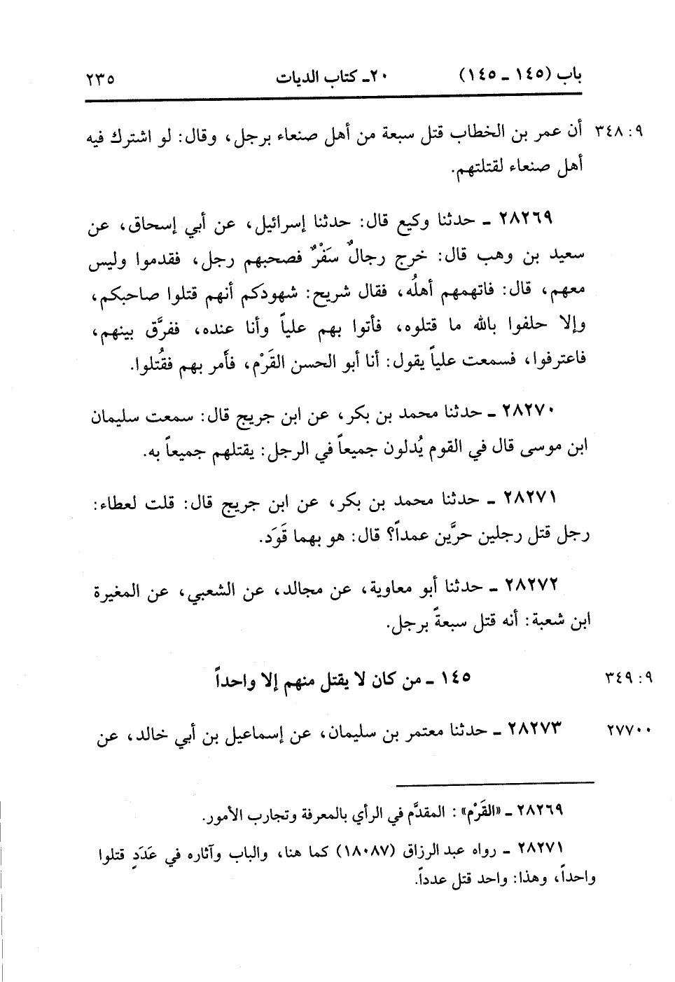 28273- حَدَّثَنَا مُعْتَمِرُ بْنُ سُلَيْمَانَ ، عَنْ إِسْمَاعِيلَ بْنِ أَبِي خَالِدٍ ، عَنْ حَبِيبِ بْنِ أَبِي ثَابِتٍ ، قَالَ : لاَ يُقْتَلُ رَجُلاَنِ بِرَجُلٍ. (9/349).